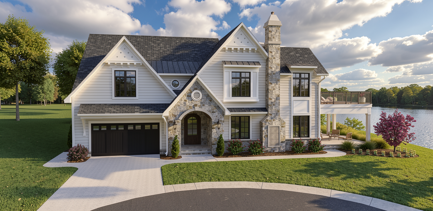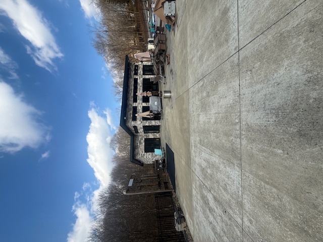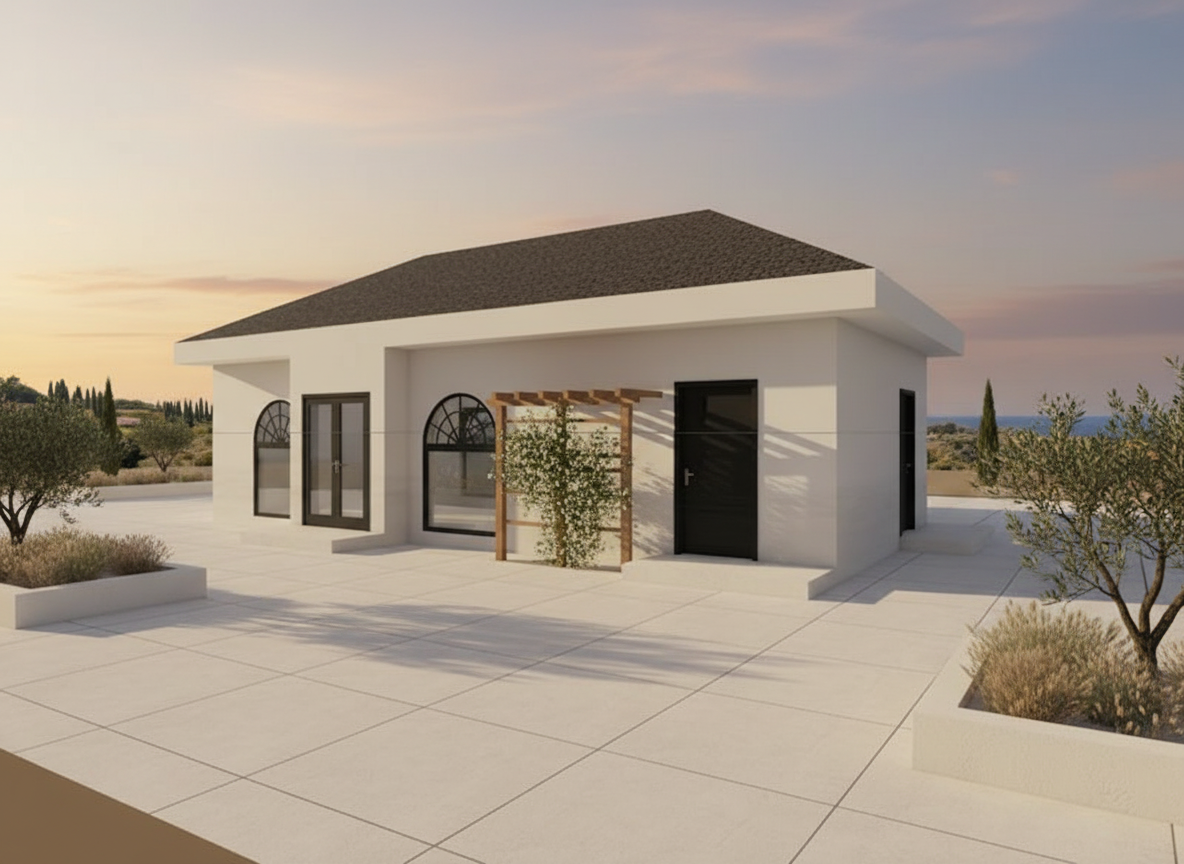 create an empty interior of this exact pool house using the reference images for scale and proportions the room should feel wide and grounded not long or stretched match the real layout view is looking straight toward the back wall from the front entry one door in the far left corner of the back wall bathroom a second door spaced far apart closer to the middle of the wall not next to the first door tv centered between the doors correct the proportions the width of the room should feel dominant reduce the depth so the room does not feel long or tunnel like back wall should feel closer and properly scaled architecture ceiling slopes from the front near viewer down toward the back wall not centered peak full glass doors on both left and right walls front wall is also glass camera positioned just inside materials must match reference large format gray stamped concrete floor with subtle variation warm neutral plaster walls natural wood plank ceiling medium tone lighting natural daylight from glass walls exterior should be bright but not overly detailed style empty architectural shell no furniture no bar no decor important use the reference images to maintain correct proportions and layout do not make the space feel narrow or elongated