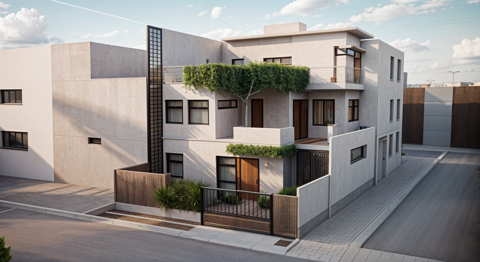 modern glassy facades with beige stone finishing for a outdoor luxury retail with umbrella terraces architecture
