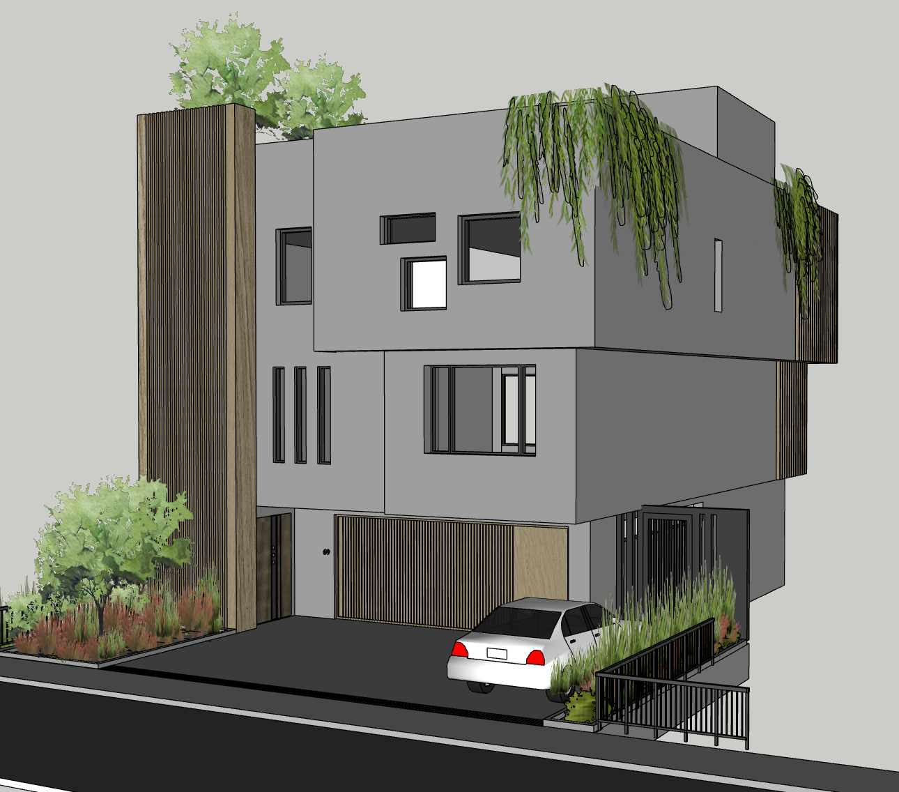 mid day sunlight mid tone gray polished concrete wall finish lush tropical greenery on roofdeck and ground floor wood louvre tower and slats accent