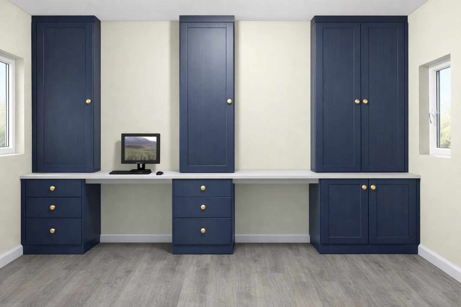 add acoustic paneling between the walls unit it should be vertical and dark brown make all the fitted furniture the same colour indigo blue