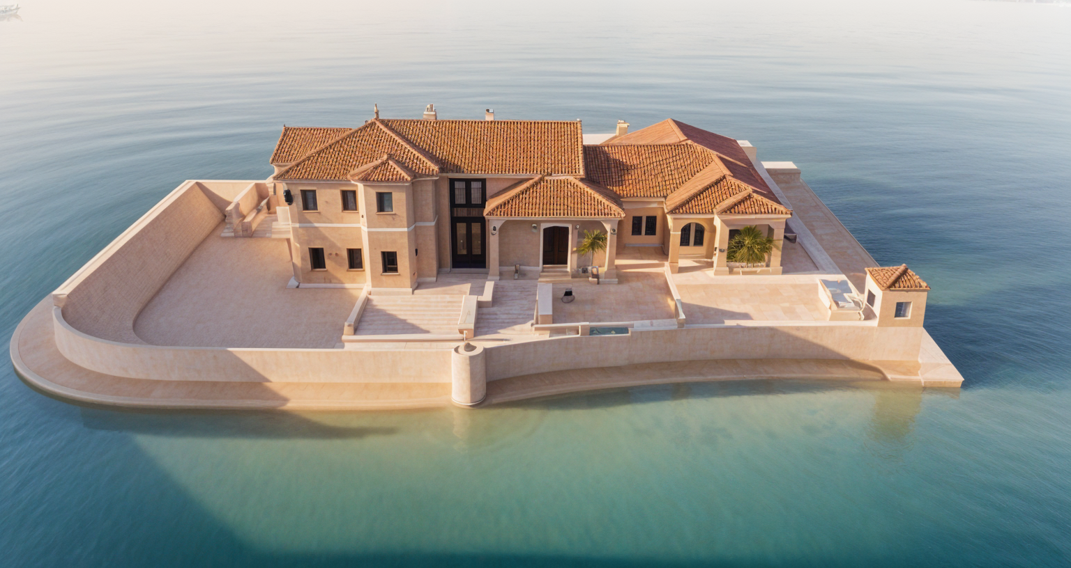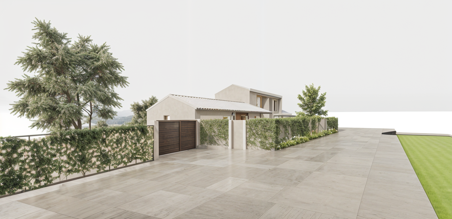 render a modern two story house on a corner lot with a sleek design use warm beige tones for the exterior walls contrasted with a dark gray roof incorporate large glass windows for a contemporary feel design a two car garage with subtle texture and a medium gray finish place the house on a well maintained green lawn the surrounding fence should be white with black accents adding modern elegance create a serene and peaceful atmosphere with soft diffused daylight capturing a clean and inviting environment