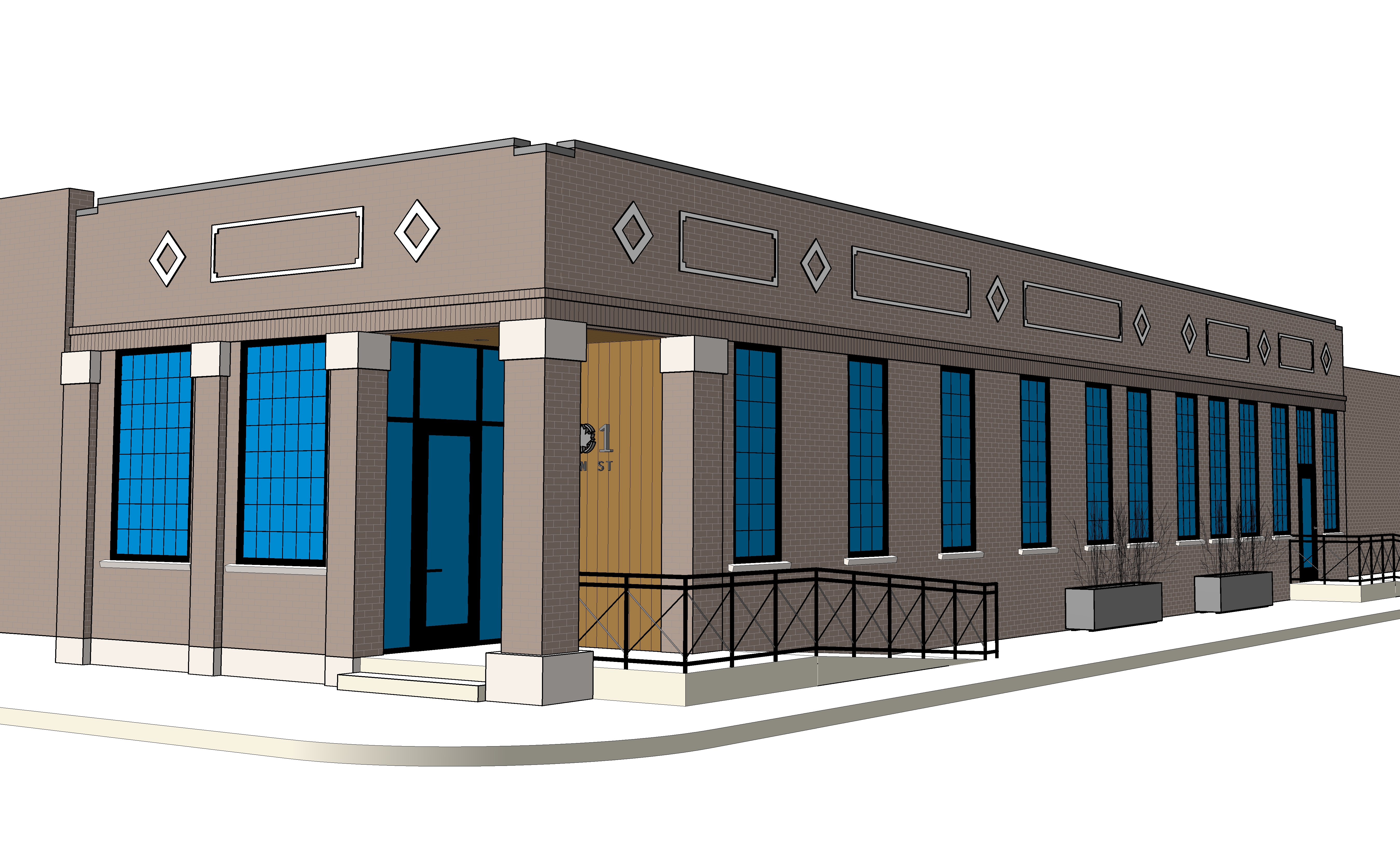 render with red orange brick render realistic surroundings new and clean show live plants in place of existing dead ones in planters from source image do not add other trees or plants