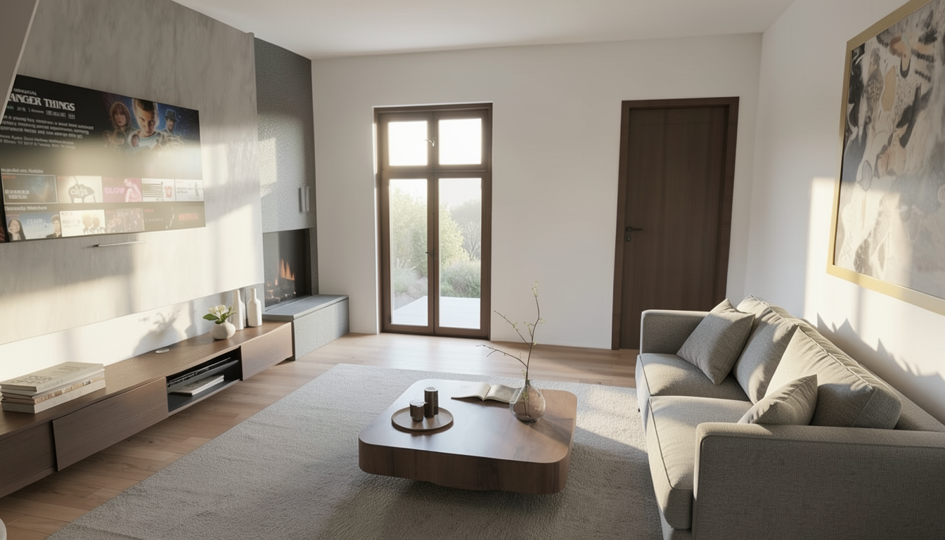 make photorealistic soft warm light with some clouds fasade in striped metal with soft gloss warm light inside the building lot of big trees higher grass with white flowers people walking and biking red sidewalk change for red fine gravel sidewalk