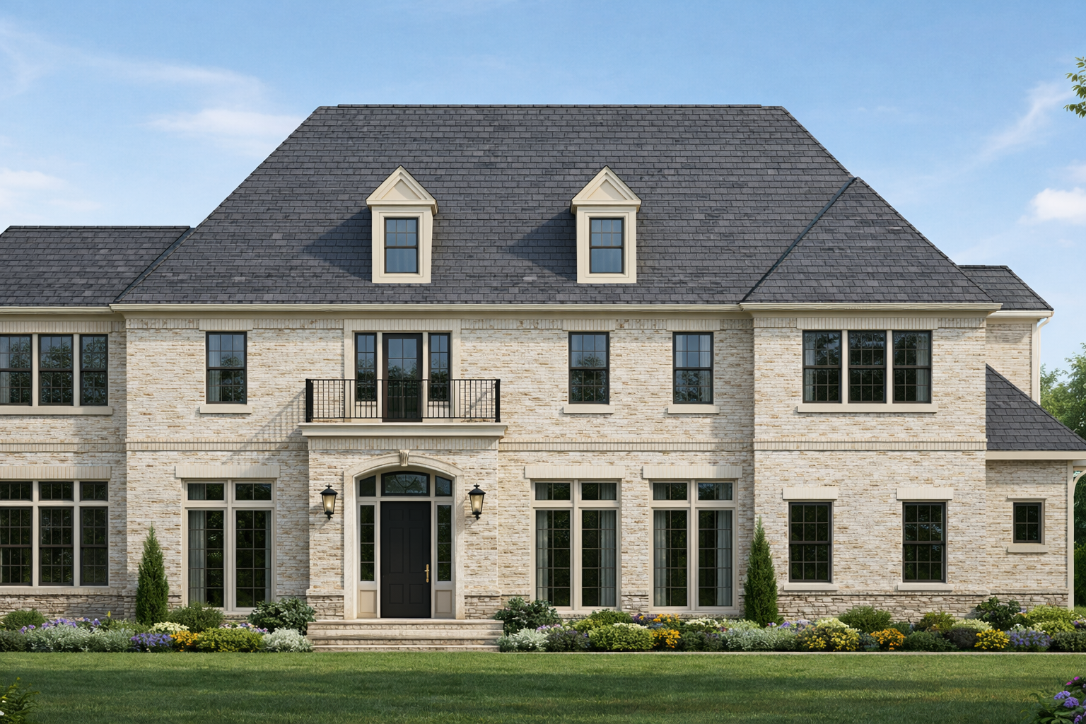take the uploaded house front elevation and create a photorealistic architectural rendering keep the overall structure rooflines and proportions very close to the original remove the small dormer windows and replace them with larger dormers on the second floor remove the door that leads to the balcony and replace it with a double window change the front door to an all black steel door maintain all existing materials colors and architectural details ensure the result looks realistic and cohesive with the original style