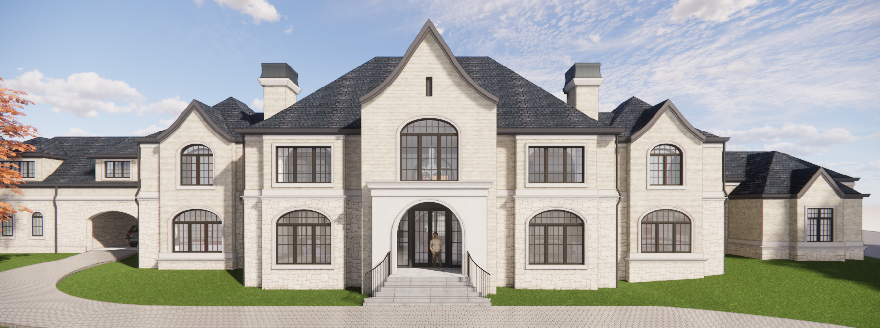 charcoal gray slate roof enhance light gray mortar in brick veneer add modern landscaping between house and driveway
