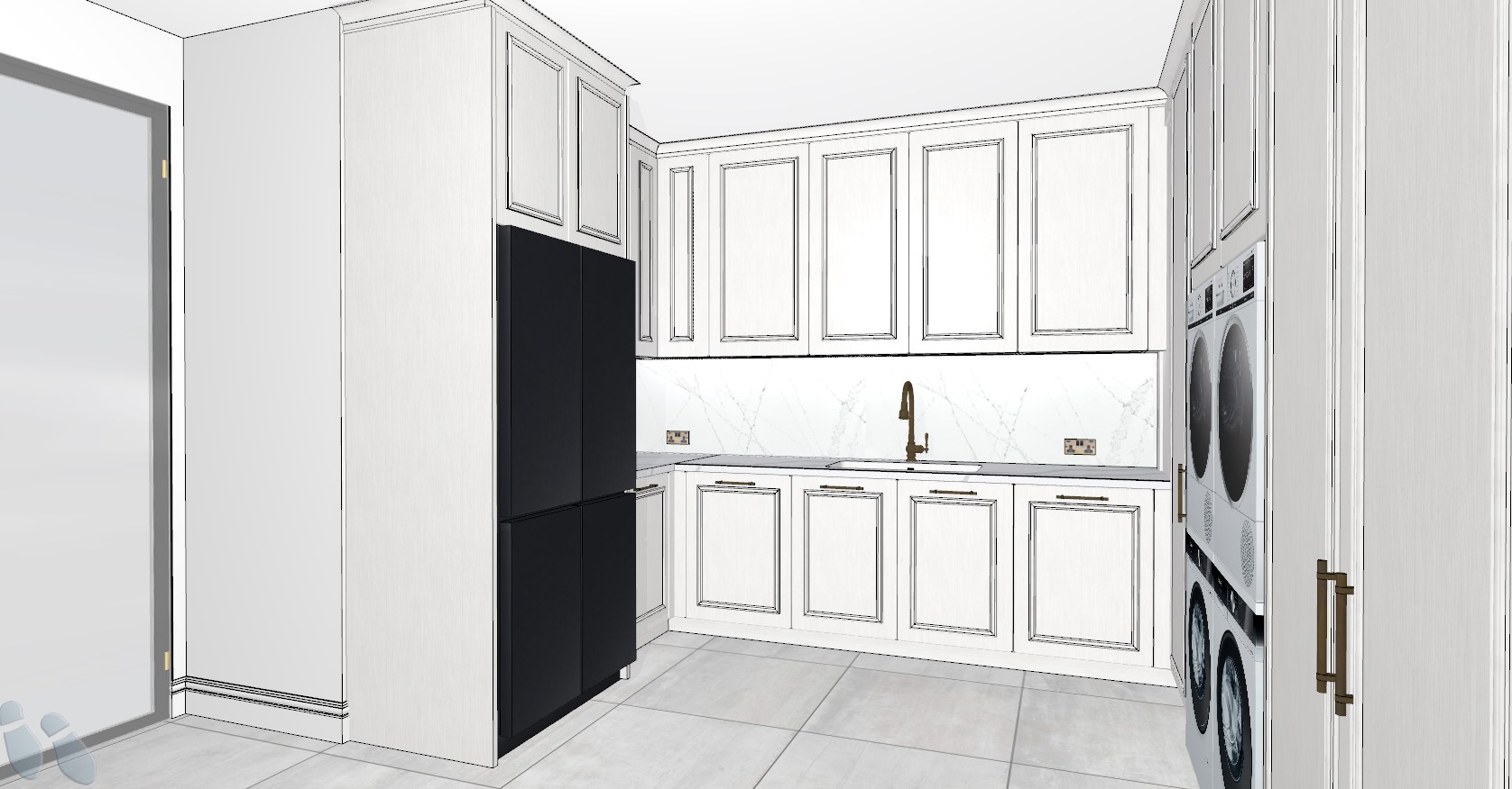 cabinetry is traditional painted off white floor tiles are matt poreclain white natural light coming into the room from the left subtle undercabinet lighting