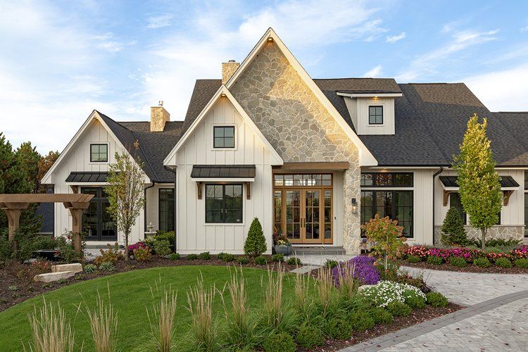 exterior shot exterior shot transitional modern farmhouse with european cottage influence