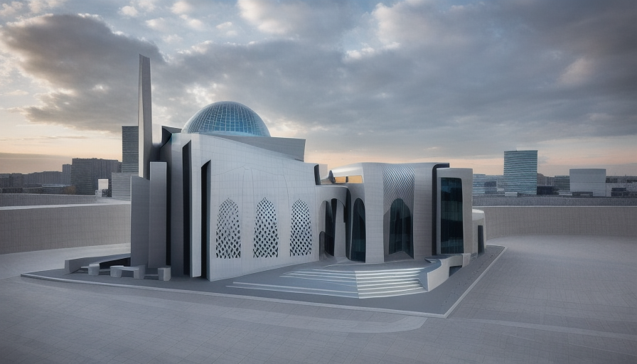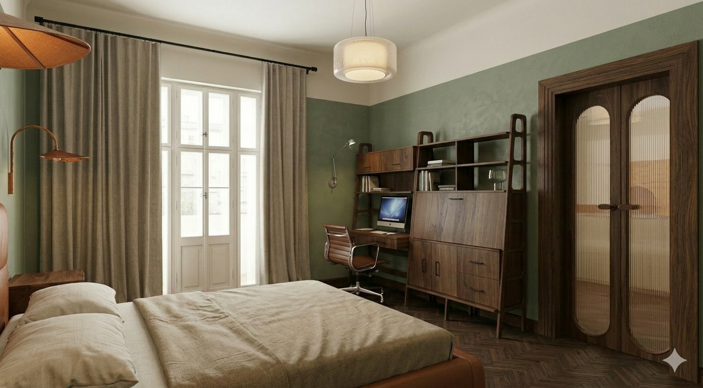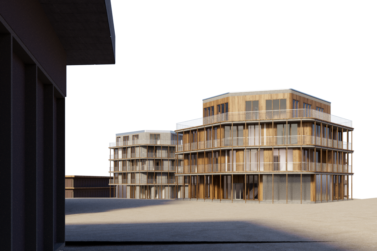 subtle overcast keep the wood color and shade architectural photography soft diffused daylight realistic materials subtle atmospheric haze bright soft light blue grey sky lushy natural grass and bushes on the ground few trees subtle natural pathways residential area lights on in the building see through curtains on the loggias in a breezy movement
