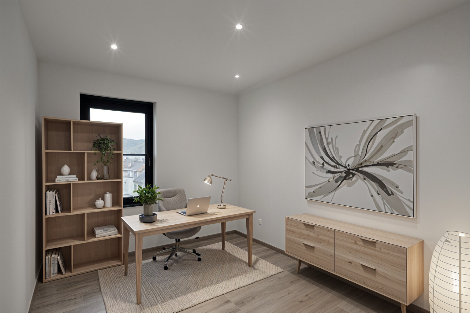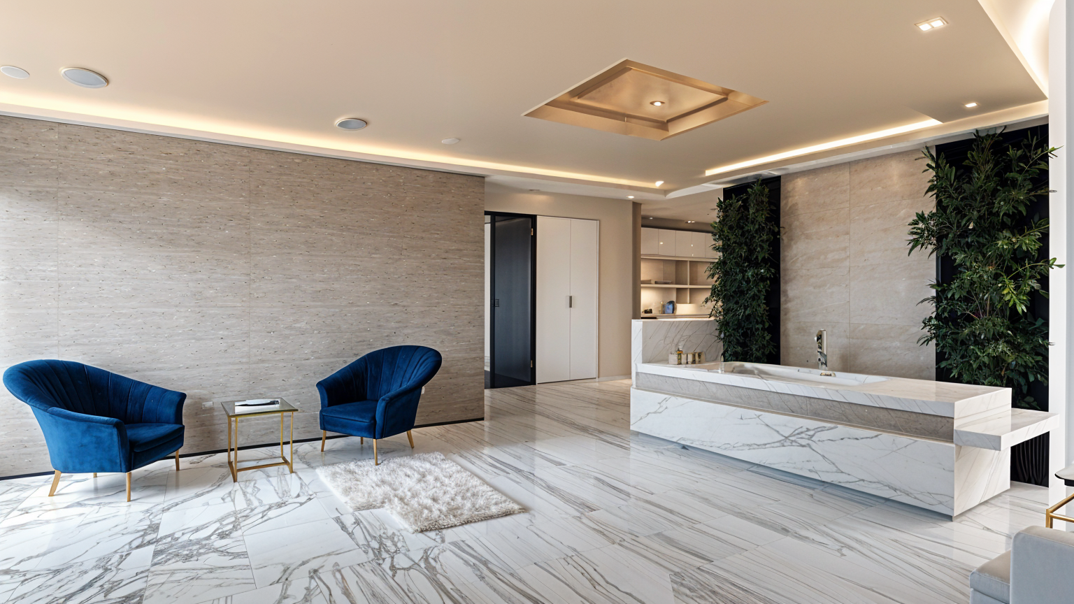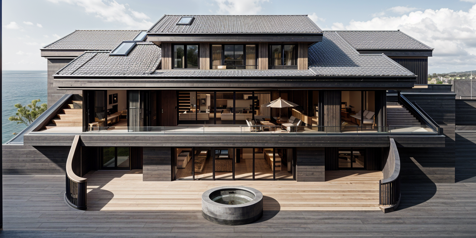 render a modern three story house with clean sharp lines and a luxurious design the house should have a flat roof with a green rooftop garden use a sleek white color for the exterior with dark grey accents for window frames and railings the balcony should have stylish outdoor furniture in neutral tones for the terrace add a light wood decking and a large umbrella in navy blue surround the house with a serene garden featuring lush greenery the atmosphere should be bright and inviting with soft natural sunlight casting gentle shadows architecture