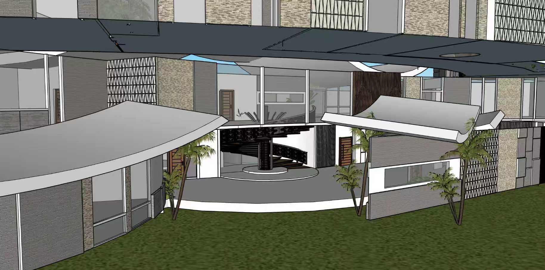 modernist perspective shot use nature coziness and greenery set in the evening with soft gentle sunlight put a stair in the middle circular architecture