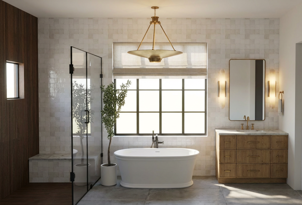 photorealistic enhancement of the provided architectural render preserve the exact architecture layout materials furniture placement and fixtures from the original image with no redesign or modifications the purpose is only to improve realism and lighting quality render as high end interior photography using a full frame camera with a 24 35mm architectural lens balanced exposure realistic dynamic range subtle depth of field and natural color grading the image should look like a professionally photographed luxury interior rather than a computer render soft natural daylight diffused window light global illumination balanced exposure do not change architecture do not change materials no redesign no new objects no additional lights no glowing fixtures no light from shower heads or faucets no dramatic shadows no surreal lighting no warped geometry no stylization the cabinet pulls and faucet should be brass