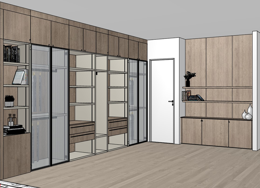 keep materials and colors as per original the four glass doors are micro ribbed closet s lights are embedded led strips in the grooves visible on closet s gables and are oriented towards the back of the closet