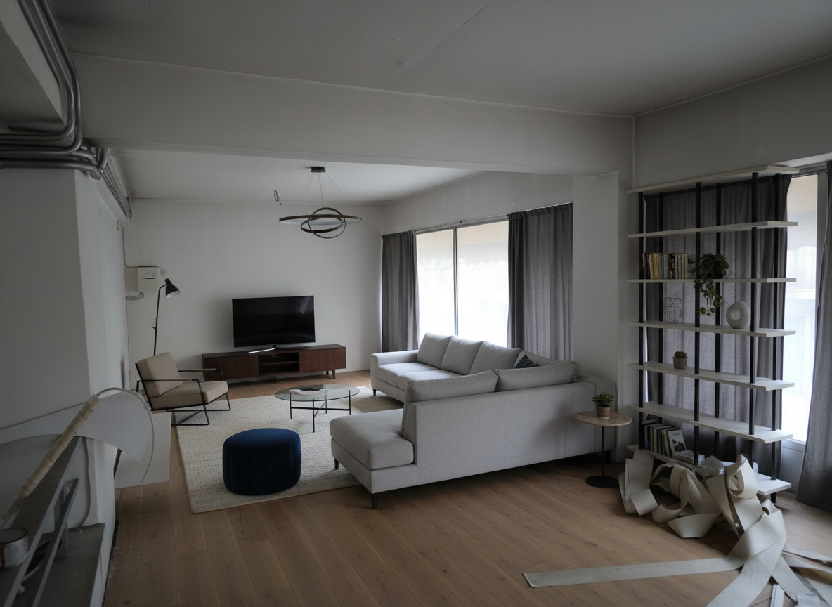 keep only walls and windows remove pipes and railing stage it as a modern flat with timber floor and hidden lights on the ceiling