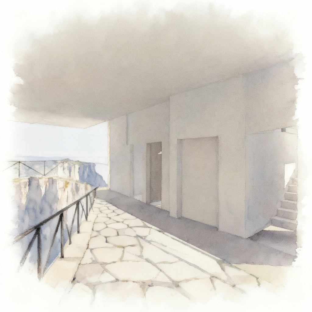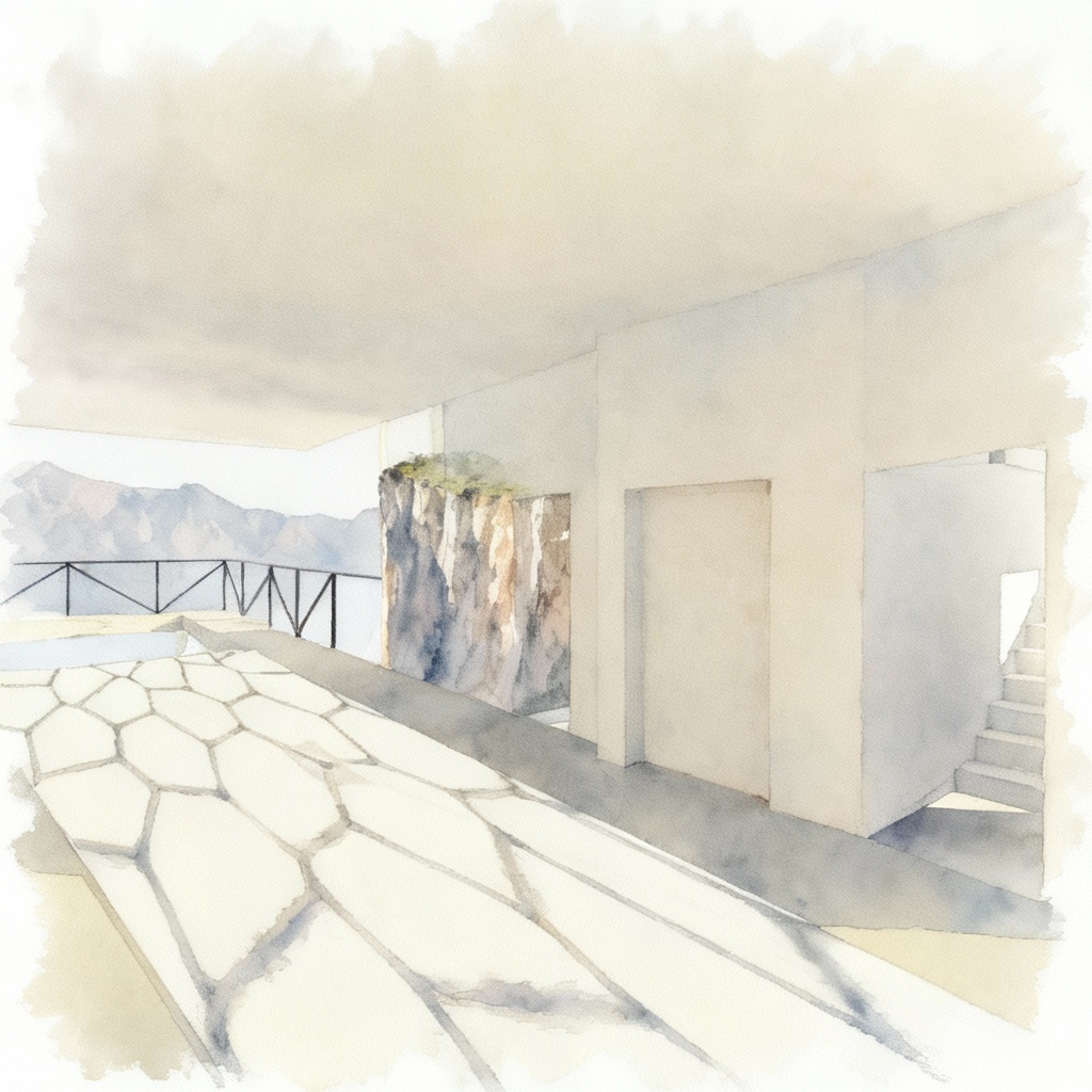 stone path have the end looking out to a mountain cliff view while maintaining original geometry make it look watercolor and begins fades out to white