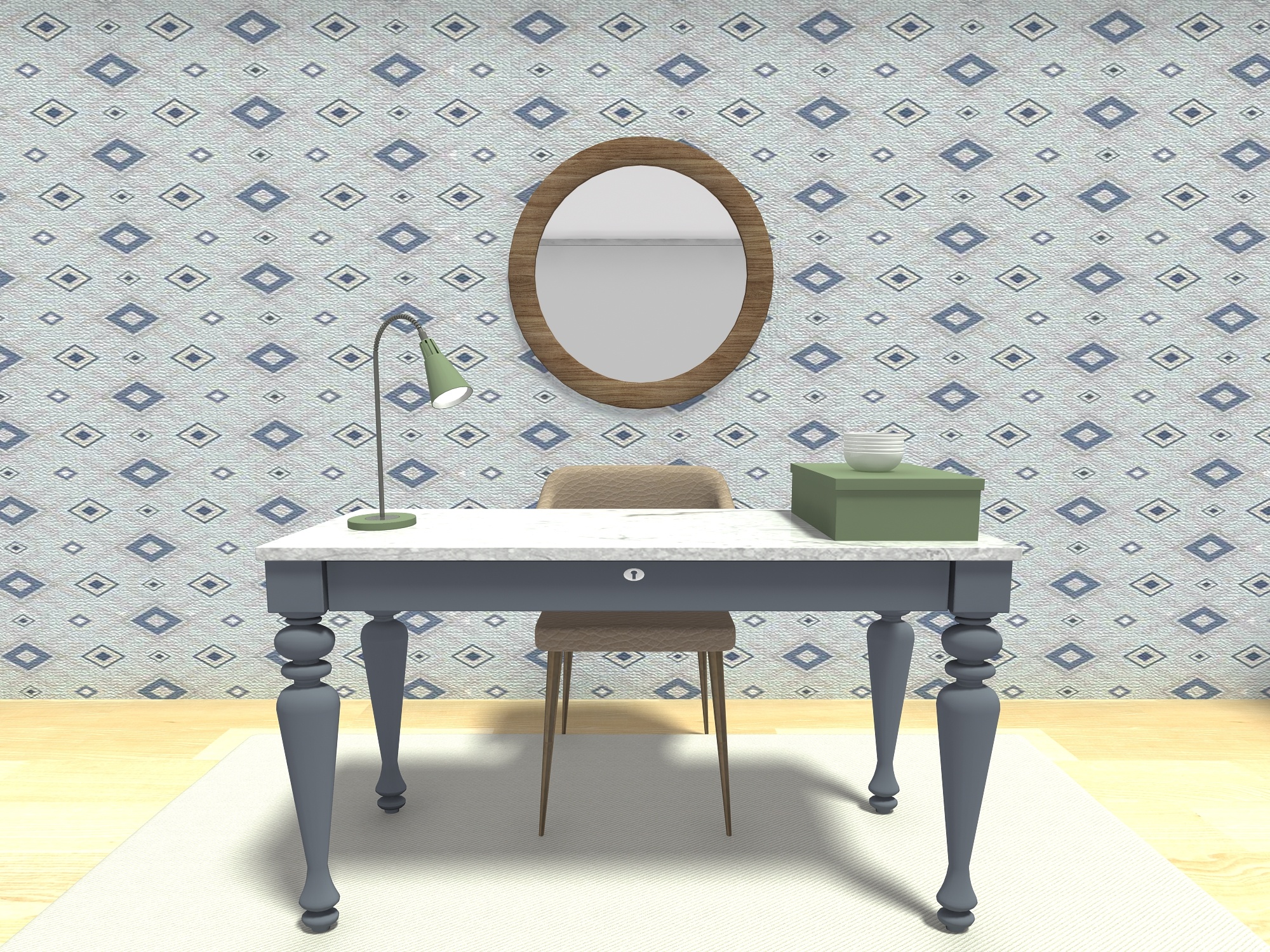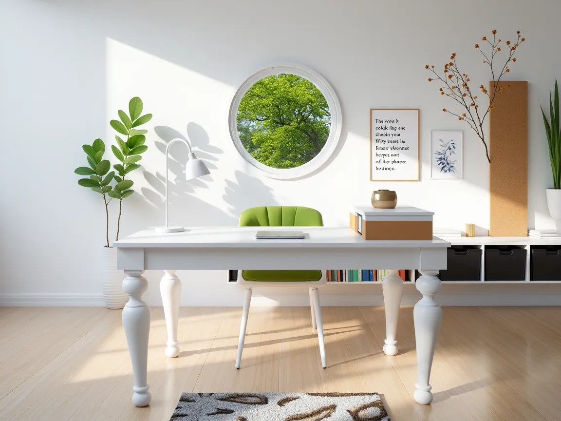 a serene and cozy home office setup bathed in natural light the room is designed with simplicity and functionality in mind featuring white walls that enhance the bright and airy feel the light wood flooring complements the clean lines of the furniture giving the space a fresh and minimalistic atmosphere a large window dominates one side of the room allowing ample daylight to flood in with a view of lush greenery outside bringing a connection to nature the workspace includes a sleek white desk with a modern computer a minimalist white chair with a soft green cushion and to the right a sleek white bookshelf stands with a mix of black white and brown storage boxes along with books and plants adding organization and subtle decorative elements above the table is a corkboard with a list of quotes and a couple of pop art style images adding a touch of personality and color the rug under the desk features a light pattern of plants and branches continuing the natural earthy theme of the room the overall style is clean modern and calming with a focus on creating a productive yet peaceful environment the use of natural elements like plants and the outdoor view helps bring a sense of tranquility to the workspace architecture