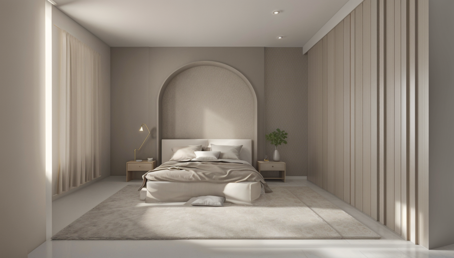 minimalism interior shot classical interior shot a cozy minimalist bedroom interior featuring a central bed with neutral toned bedding in soft beige and muted brown the room is softly illuminated by warm ambient lighting accentuating the arch behind the bed the flooring is light oak wood complemented by a subtle textured gray rug on either side of the bed are elegant modern nightstands with decorative items like a slender vase and reading material the walls are a gentle cream adding to the serene atmosphere tall curtains in soft white frame one side of the room creating a peaceful inviting ambiance architecture architecture