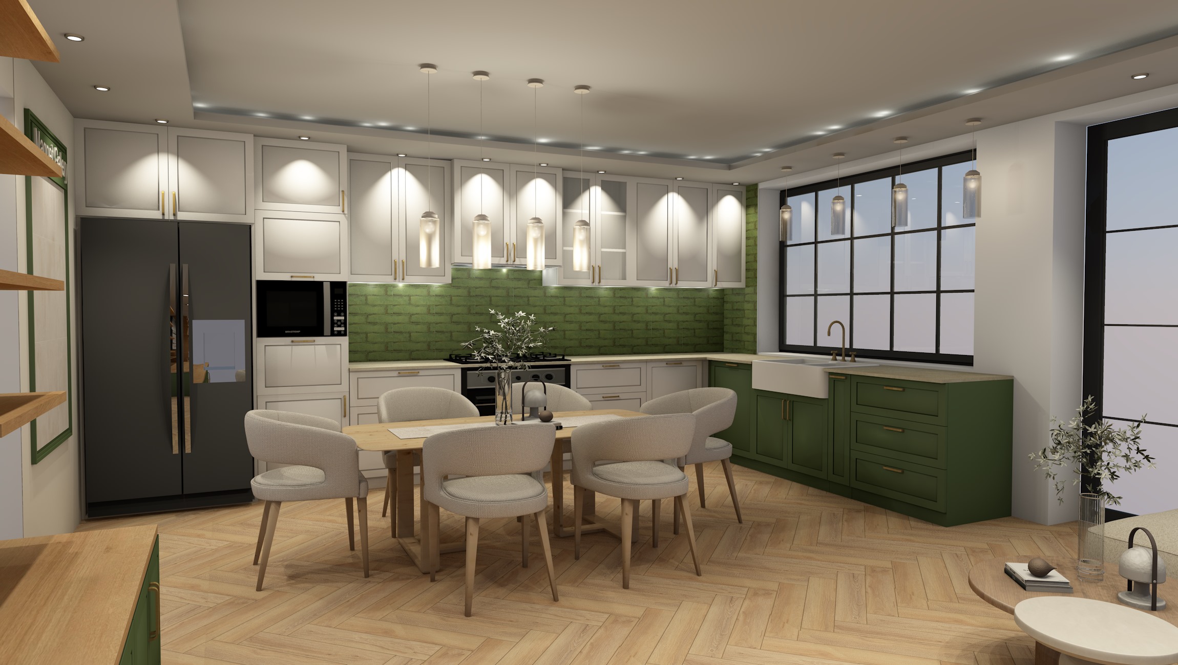 create a photorealistic kitchen visualization with a completely white kitchen do not include any green elements anywhere in the design use andalusian patterned tiles as the backsplash or decorative surface