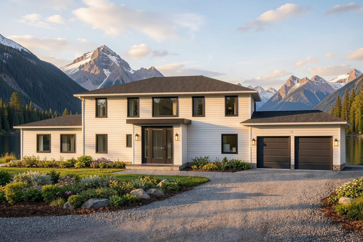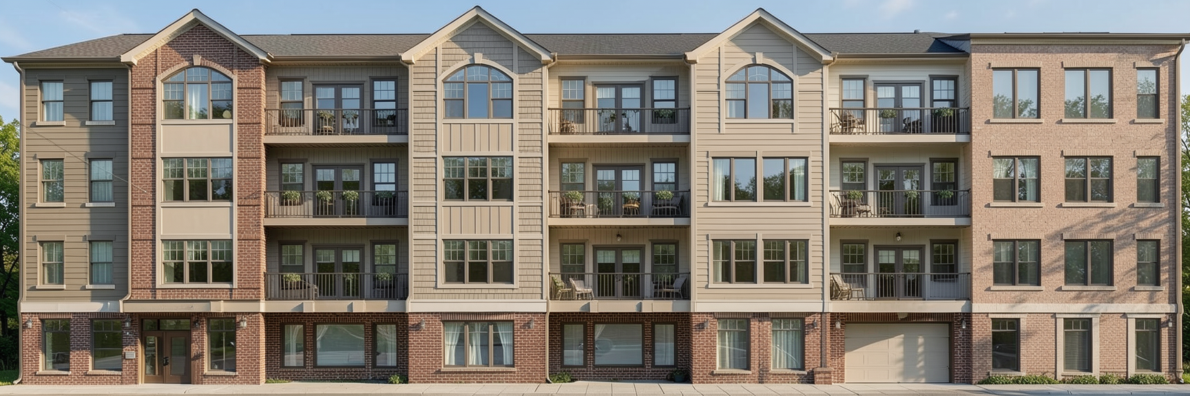 this property is located at 476 main st stoneham ma i need an exterior elevation in 3d realistic format use brick only on the bottom first floor band and hardie panel and lap siding above the first floor ensure all of the siding sections are consistent on each section do not put any fencing on the roof line