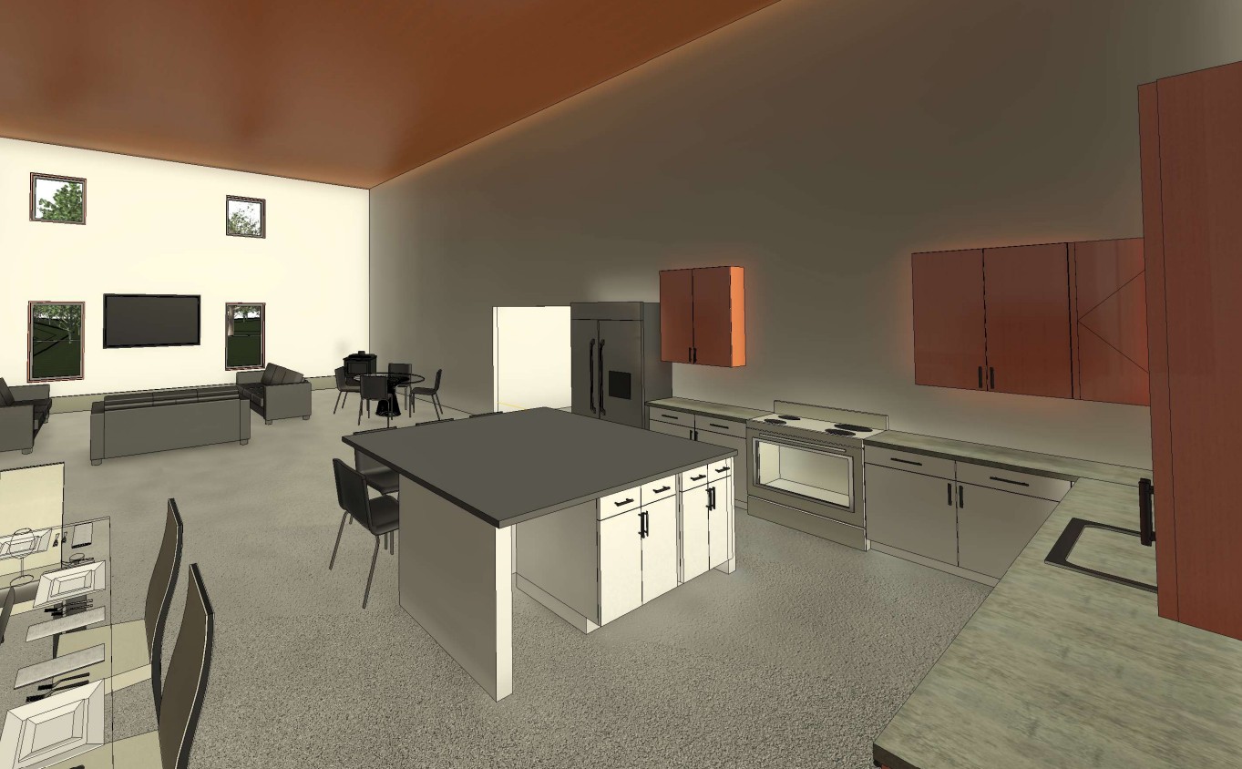 colonial revival interior shot wood burning stove in far corner stained wood cabinets white quartz countertop architecture