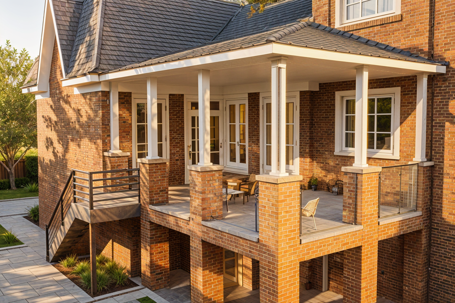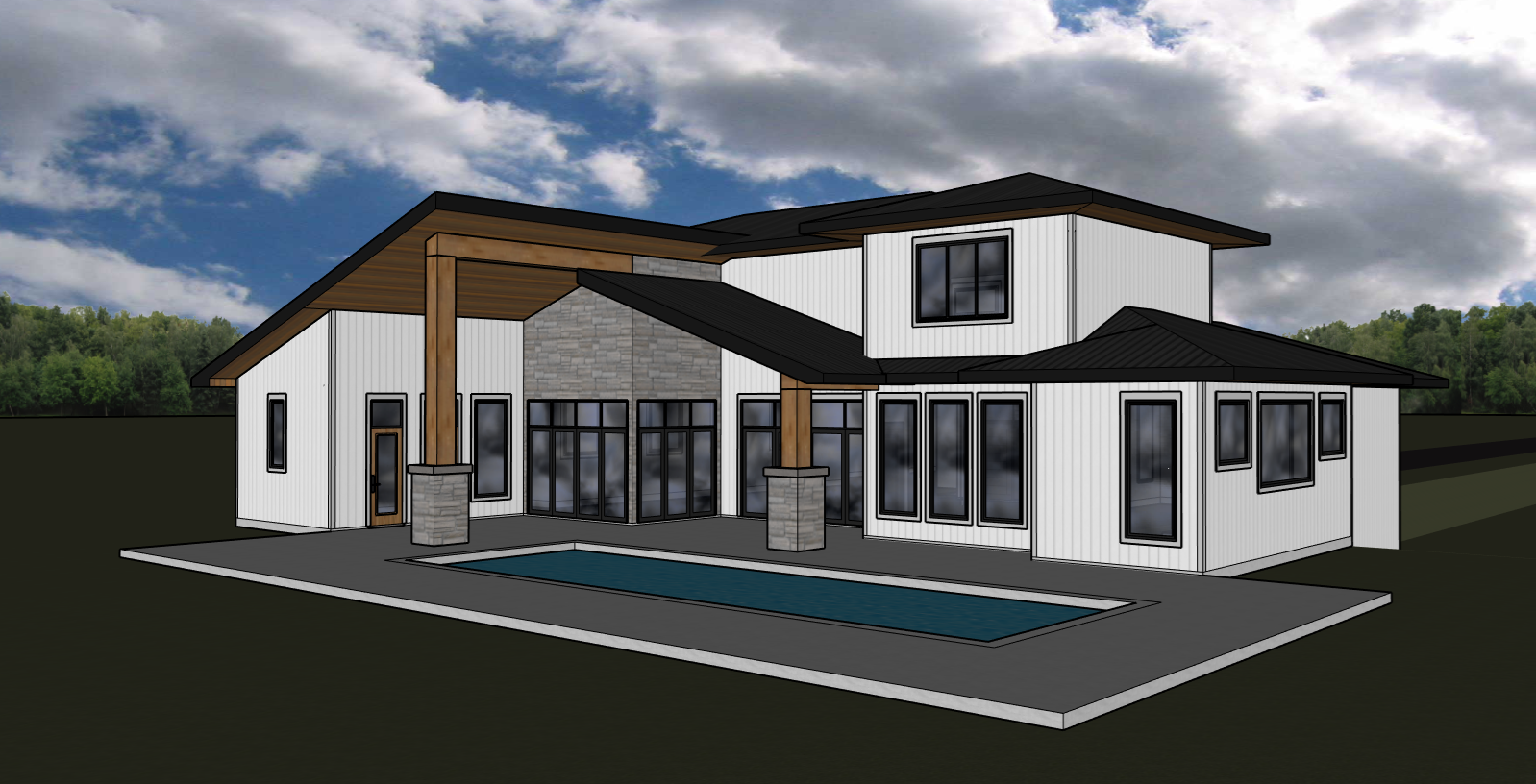 render a photorealistic 3d perspective of this house in a muskoka ontario reference the current material styles and colours just enhance the standing seam metal roof vertical white wood siding concrete walks keep model geometry the same windows doors roof walls make natural vegetation that looks native to muskoka do not change the view only enhance the current materials and make the landscape nicer vegetation detailed textures in the wood siding and glass reflections and a vibrant clear sky with light atmospheric depth render in hyper realistic architectural visualization quality 8k resolution make vegetation realistic with pine and maple trees like in muskoka ontario canada natural vegetation in summer season