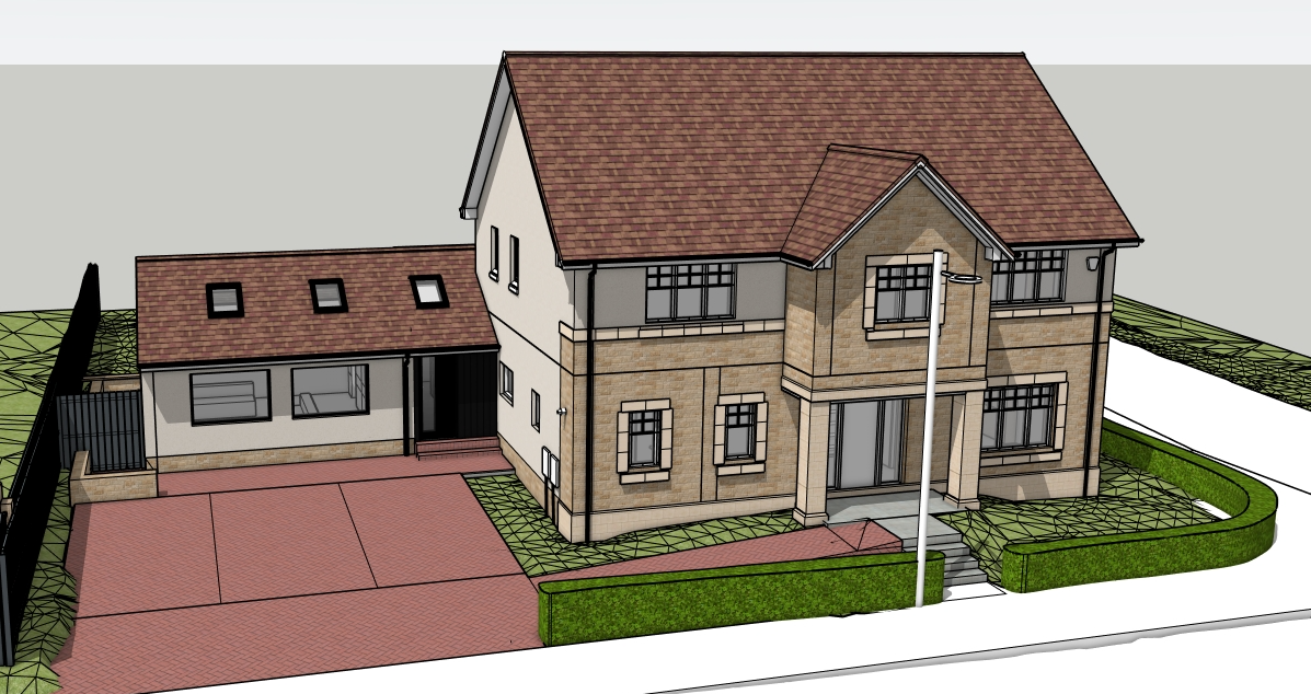 render a beautiful two story house with a beige stone facade and a brown tiled roof the house features large modern windows with white frames the driveway is a muted red brick color surround the house with well manicured green hedges and a small lawn the sky is a clear soft blue with a warm golden sunset atmosphere casting gentle shadows use realistic lighting to emphasize the textures and colors creating an inviting and harmonious scene