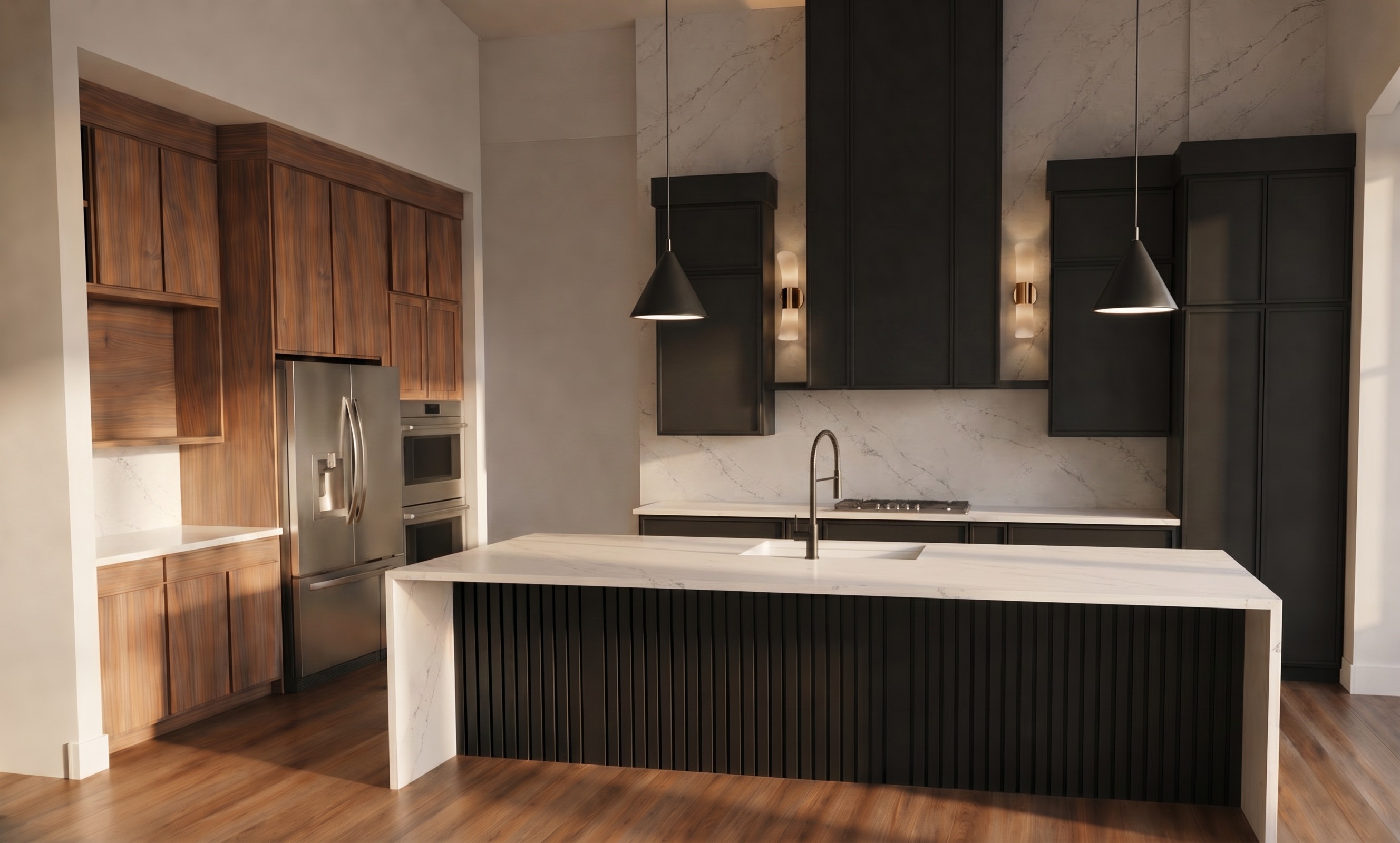 change the wall behind the sconces only up to the top of the cabinets to a black penny round tile the wall above and on each side of the black vent hood will be just painted white drywall
