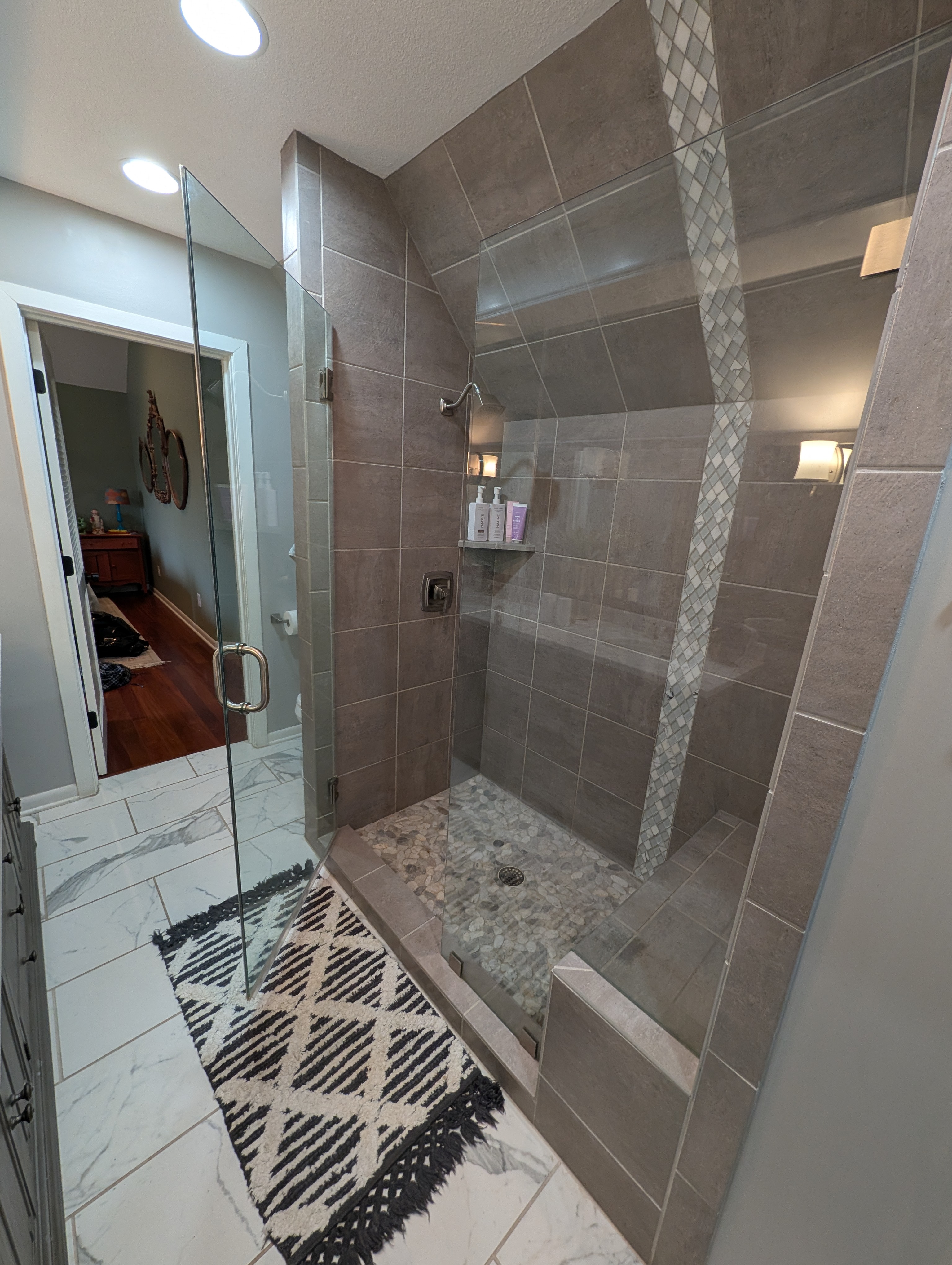 change tile to smaller subway tile with herringbone design and gold fixtures change floor tile to black octagon tile