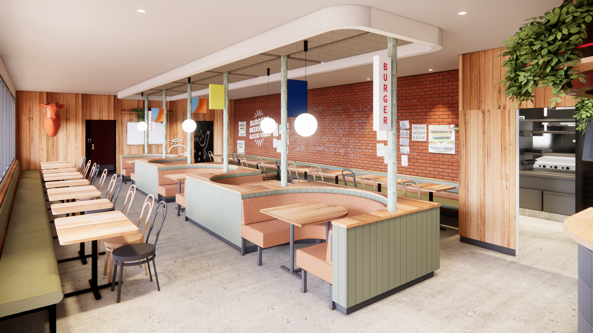 add food related posters on brick wall populate and replace boxes on columns with lightboxes do not change existing textures
