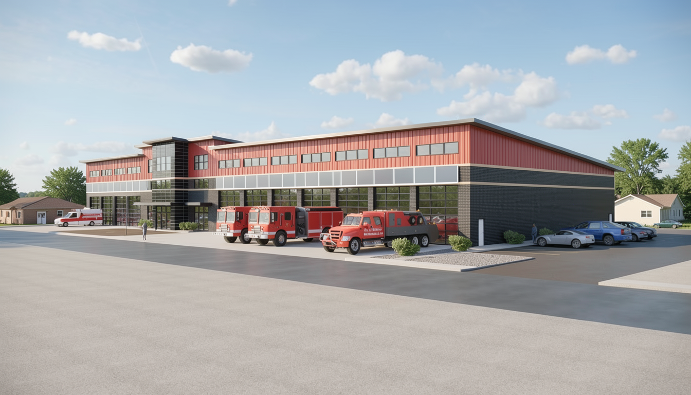 realistic rendering of a fire station don t change anything on the building keep windows doors colors materials everything as it s shown full glass garage doors as shown black brick with white grout where shown with tan band red metal siding on the top middle part has 16 x 52 metal panels keep all windows as shown flat steel canopies where shown on the front don t add any more of them small buildings shops and homes in the background with a few trees