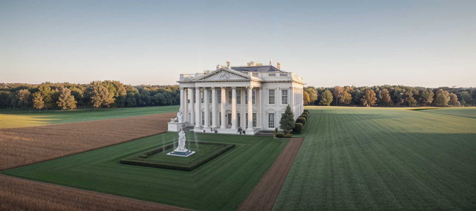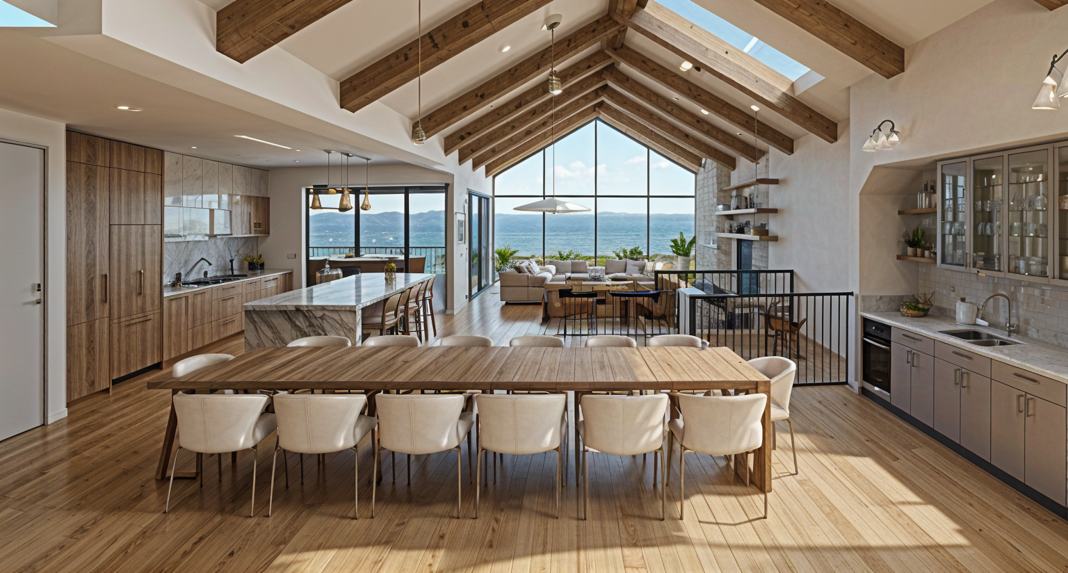 modernist exterior shot visualize a modern residential building with a contemporary design the building should have wooden exterior walls large windows with reflective glass and sleek black accents along the edges the atmosphere should be light and airy with clear blue skies and soft sunlight casting soft shadows the surrounding landscape should include lush green grass colorful flowering shrubs and tall deciduous trees with autumn colored leaves architecture architecture