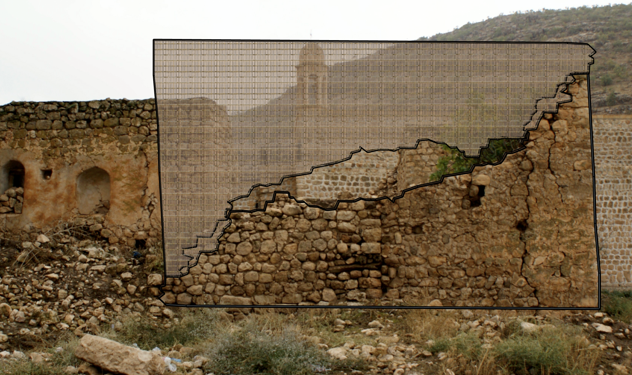just make it more realistic old ruined wall and ruin city and minimalistic touch of metal steal bars opying the wall and levitating making a hole in between