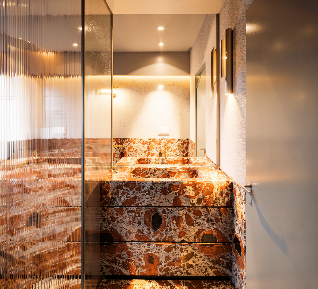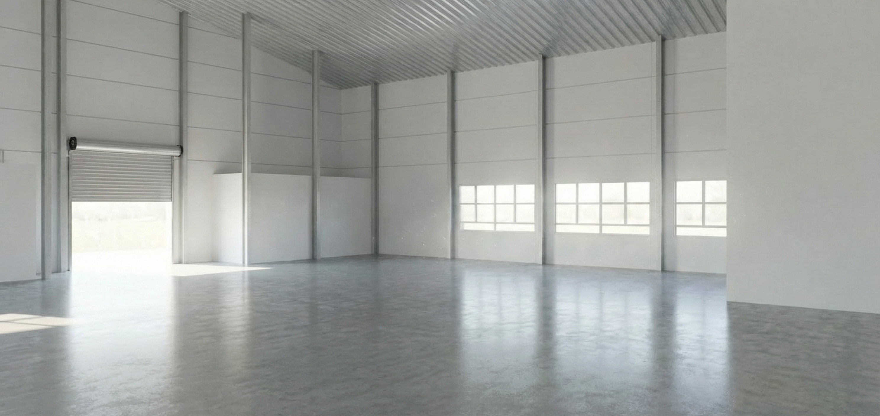 make window frames in background black add mezzanine in front of the windows up just before the roller shutter mezzanine to have full height plasterboard walls with some black framed modern glazing