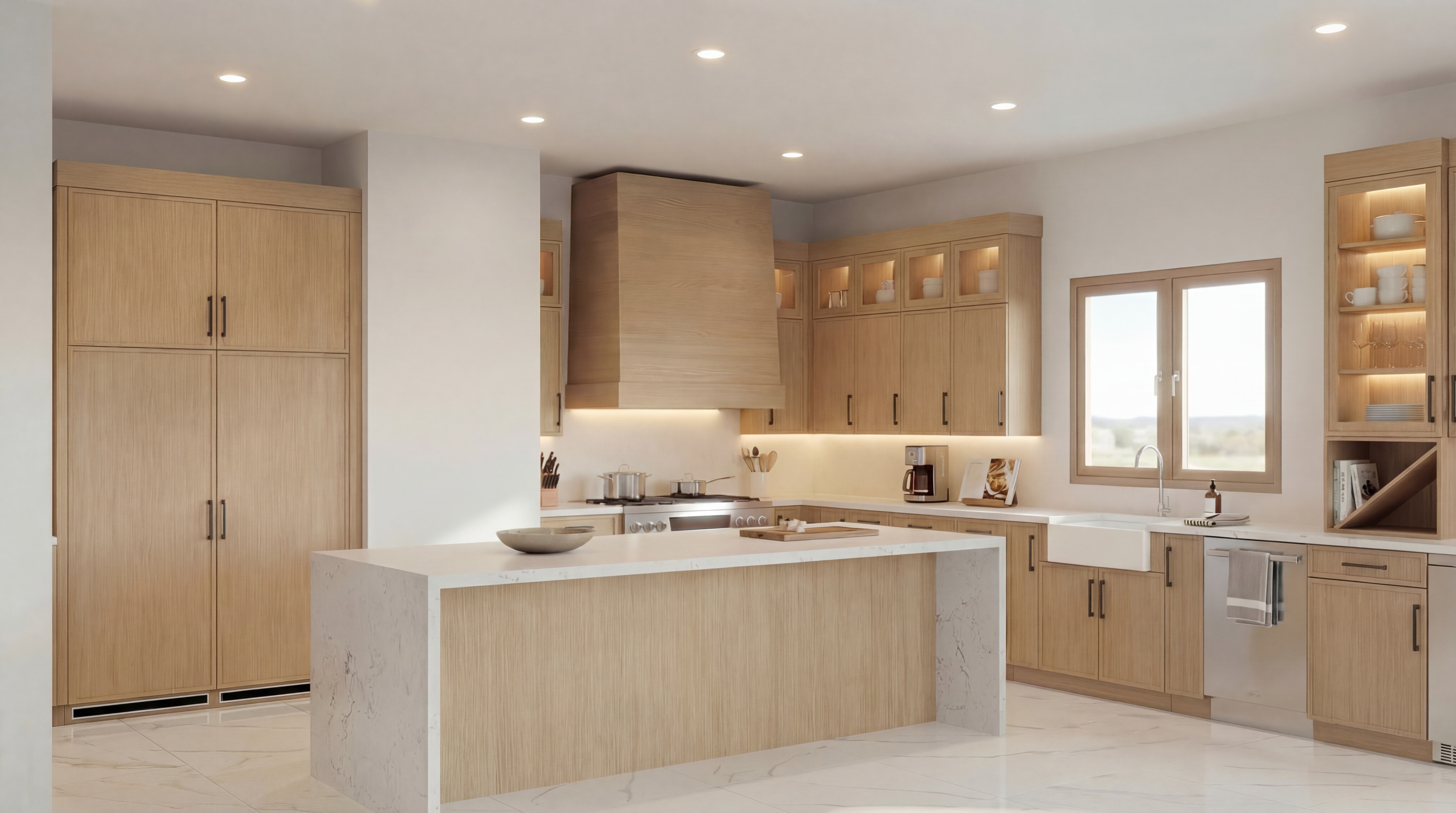 natural soft lighting soft oak cabinets