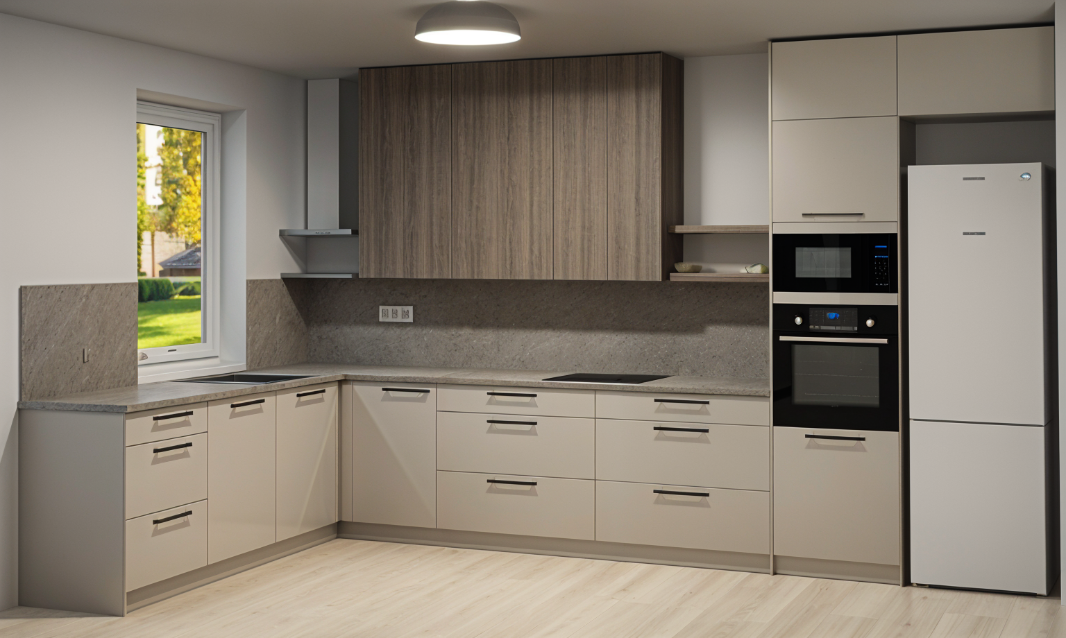the black on the right is marble counter top the two black recatngles of the left are washer and dryer the walls are shiplap and thr upper cupboards are shimplap