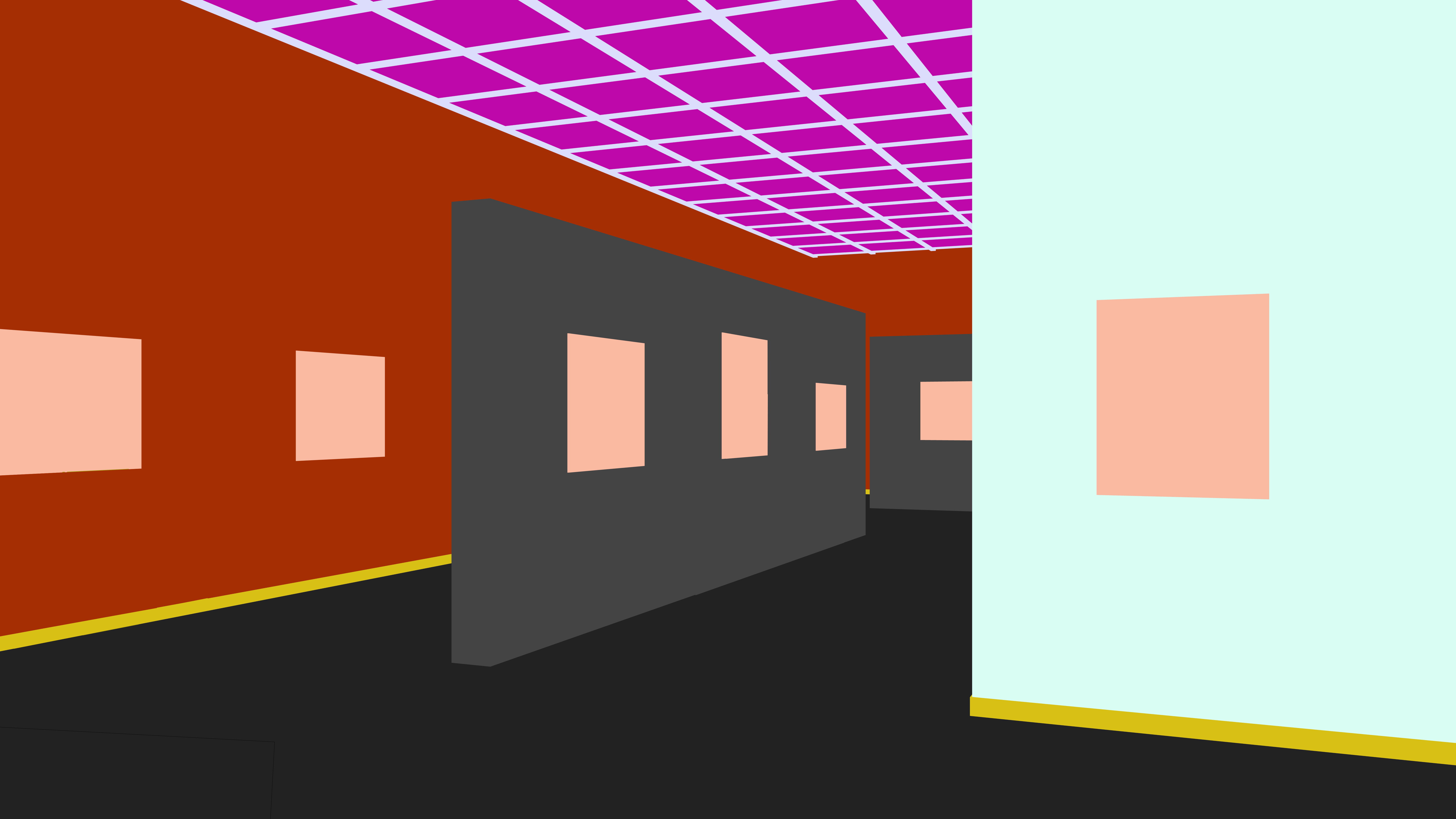 minimalism interior shot oak floor white walls white paintings light only from ceiling white translucent ceiling architecture