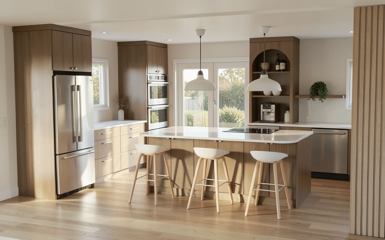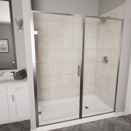 a high end hyper realistic professionally styled real estate photograph of a modern bathroom the scene features strong architectural symmetry and contrast the dominant elements are a large glass panel shower no water spots on the glass