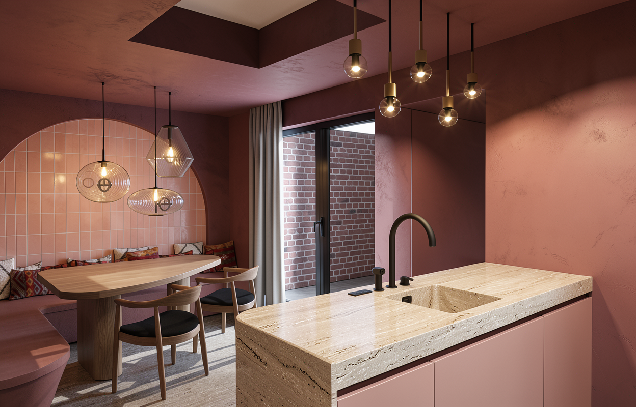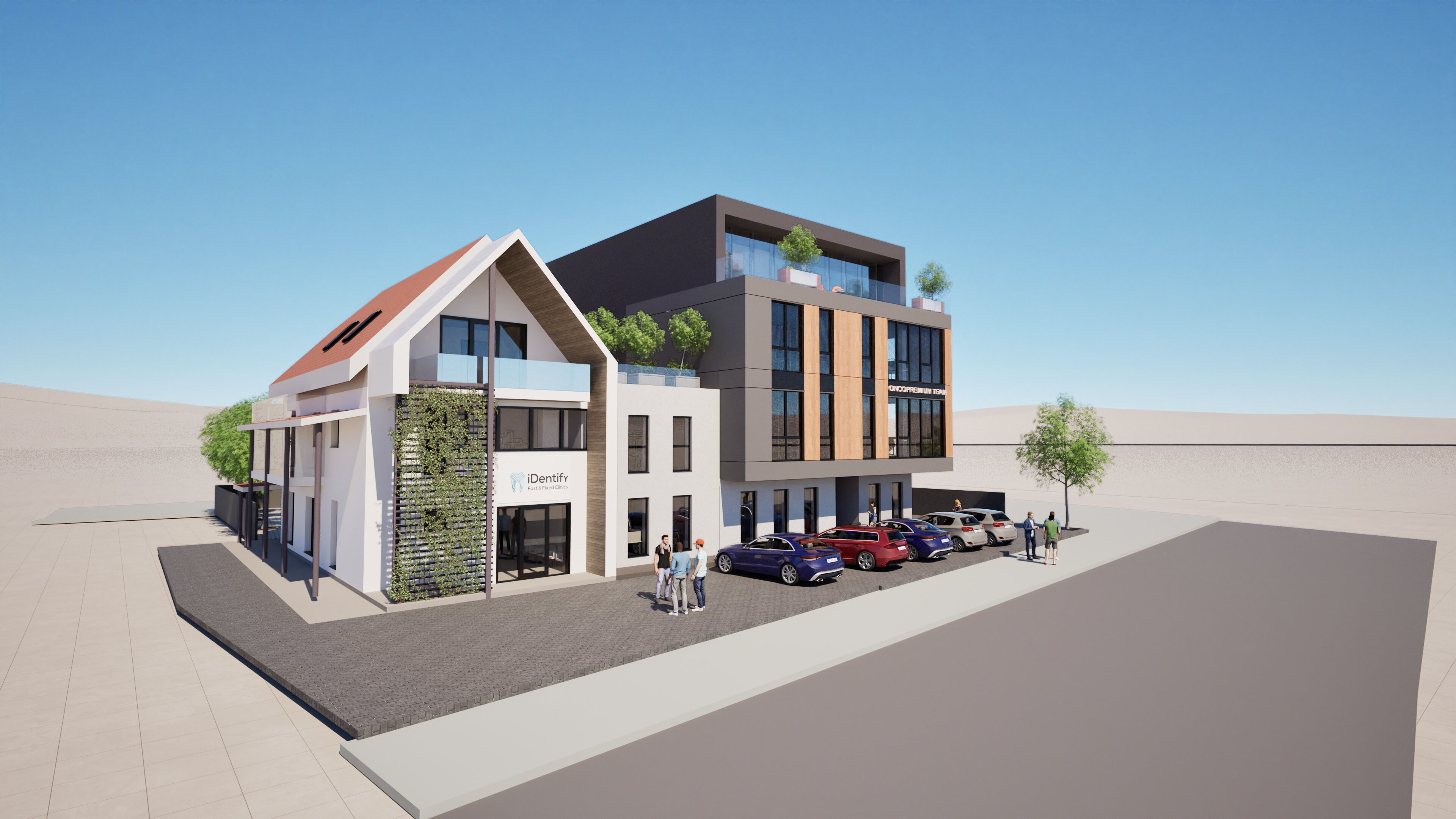 exterior shot overlay the two images insert the part of the moodboard that follows the white building into the original image