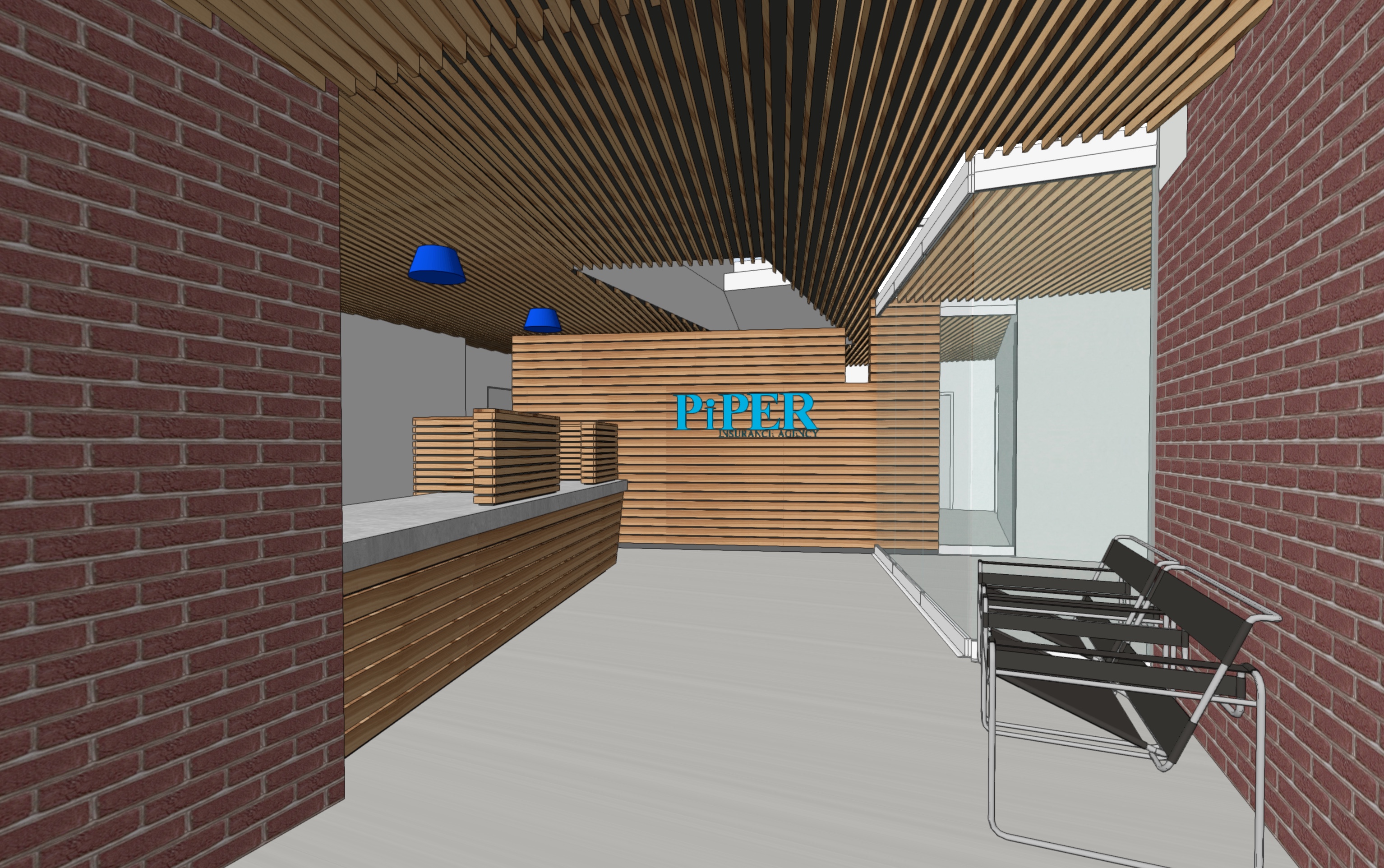 luxury lobby for insurance agency add a person working at reception desk light should be coming in from above at the skylight in the back of the image grey tone wood floors white wash the brick walls all other walls should be white add people in the conference room to the right of the image a happy work environment add linear lights to the wood ceiling