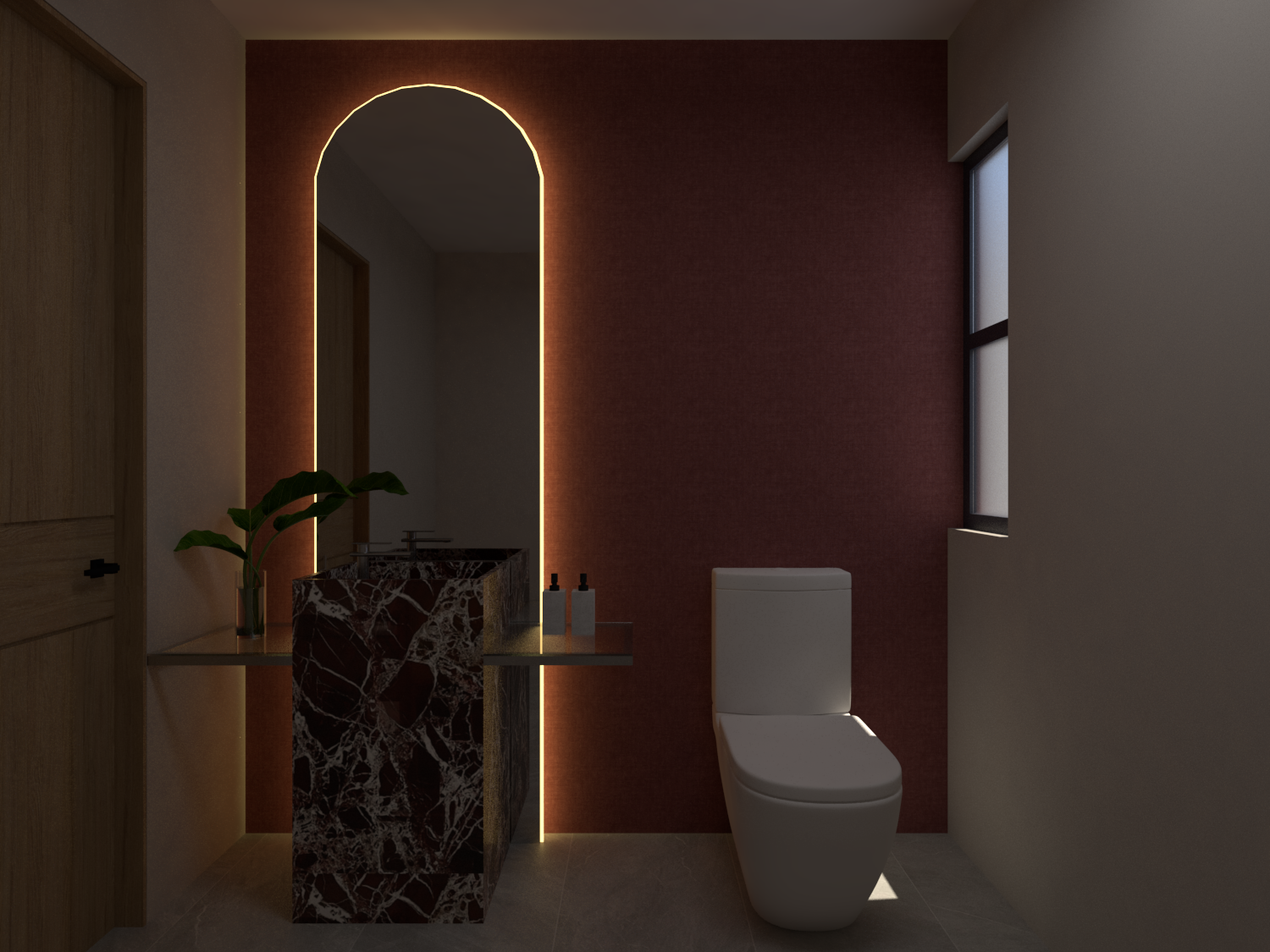 interior shot create a modern bathroom with a soothing ambiance a large arched backlit mirror with a golden glow on a warm maroon wall place a sleek white toilet on the side and a stylish vanity with a dark marbled finish and chrome fixtures add a single lush green plant on the vanity the flooring is smooth light grey stone wood door in light oak the lighting is soft natural from the window casting gentle shadows creating a serene and luxurious atmosphere architecture