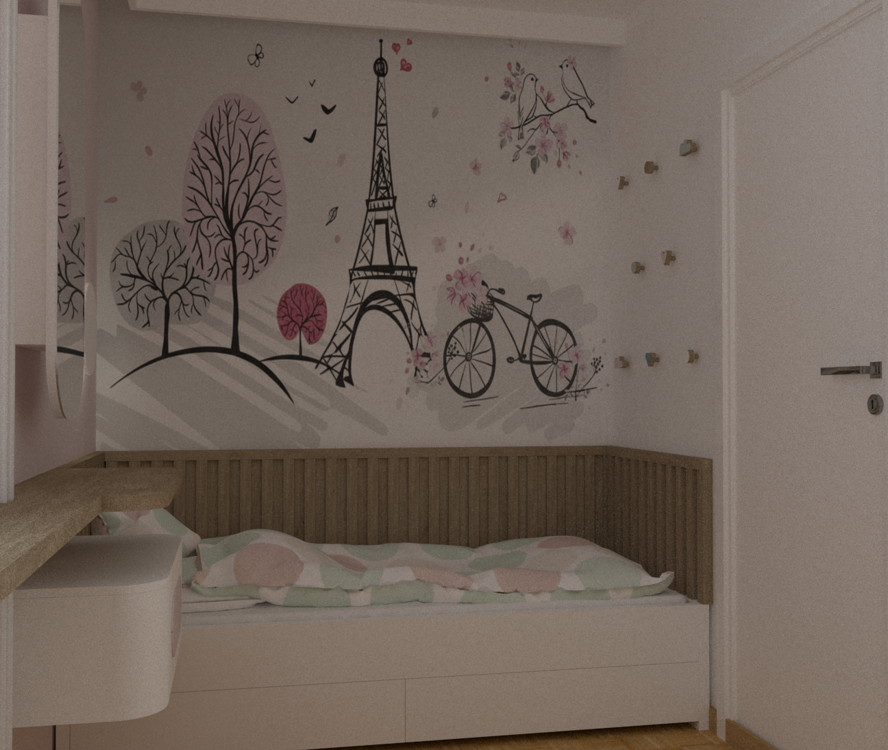 add natural light window is on the left wall add on the hooks on the right wall above bed girly bags jacket necklesses scarfs