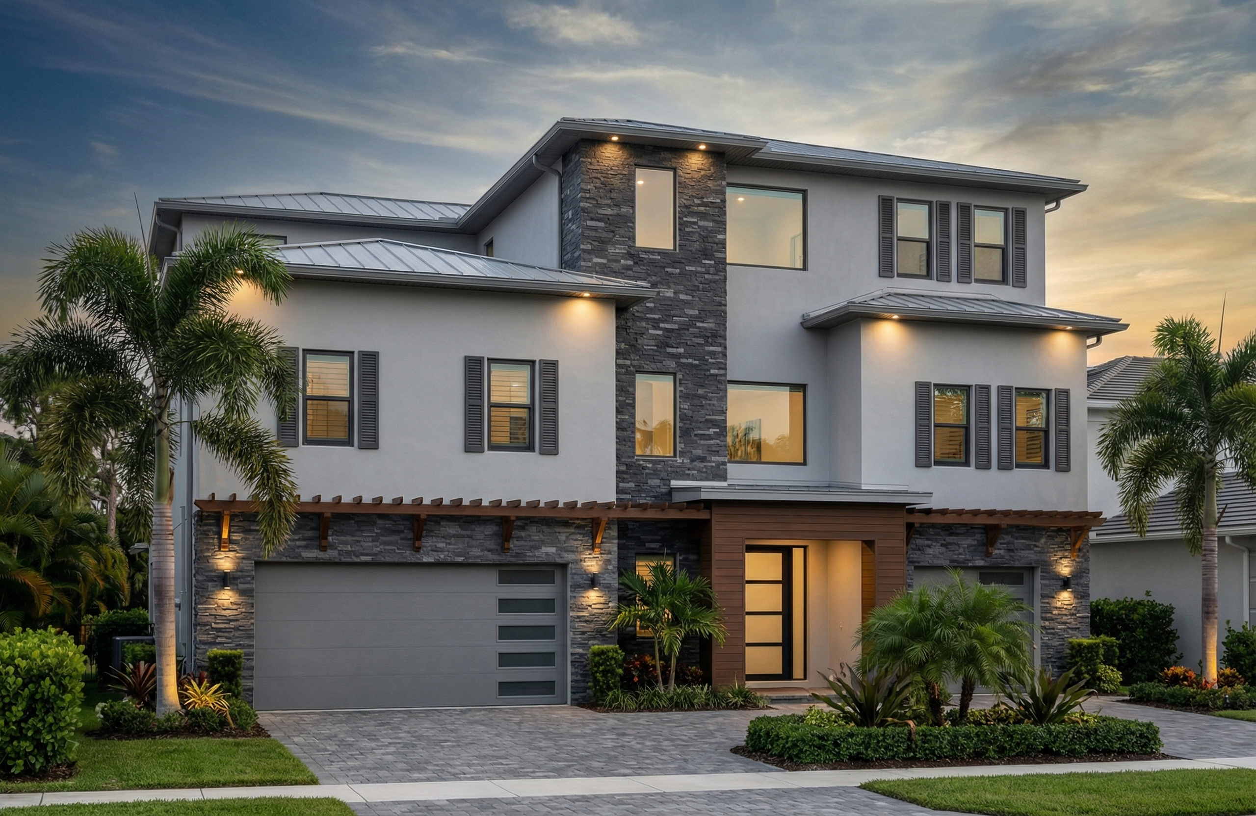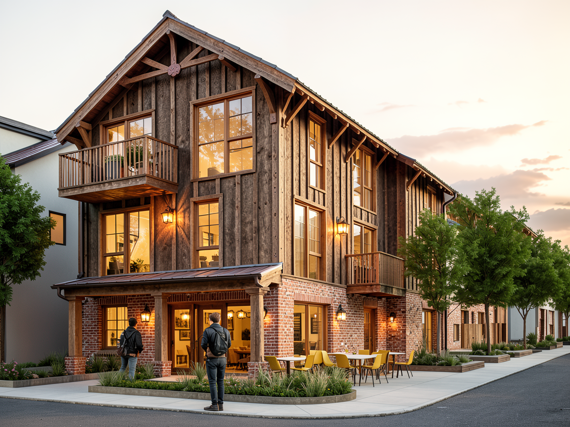 transform the modern structure into a traditional arts and crafts style residence replace flat surfaces with vertical board and batten siding with red tumbled brick near the base of the structure features low pitched gable roofs with wide overhanging eaves exposed decorative rafter tails and tapered square columns supporting a deep front porch windows should be vertically oriented multi pane true vertical oriented divided lite with thick wood trim incorporate earthy textures hammered copper hardware metal roofing and tumbled brick accents lighting should be warm featuring mission style amber glass lanterns high detail organic textures cozy and artisanal atmosphere