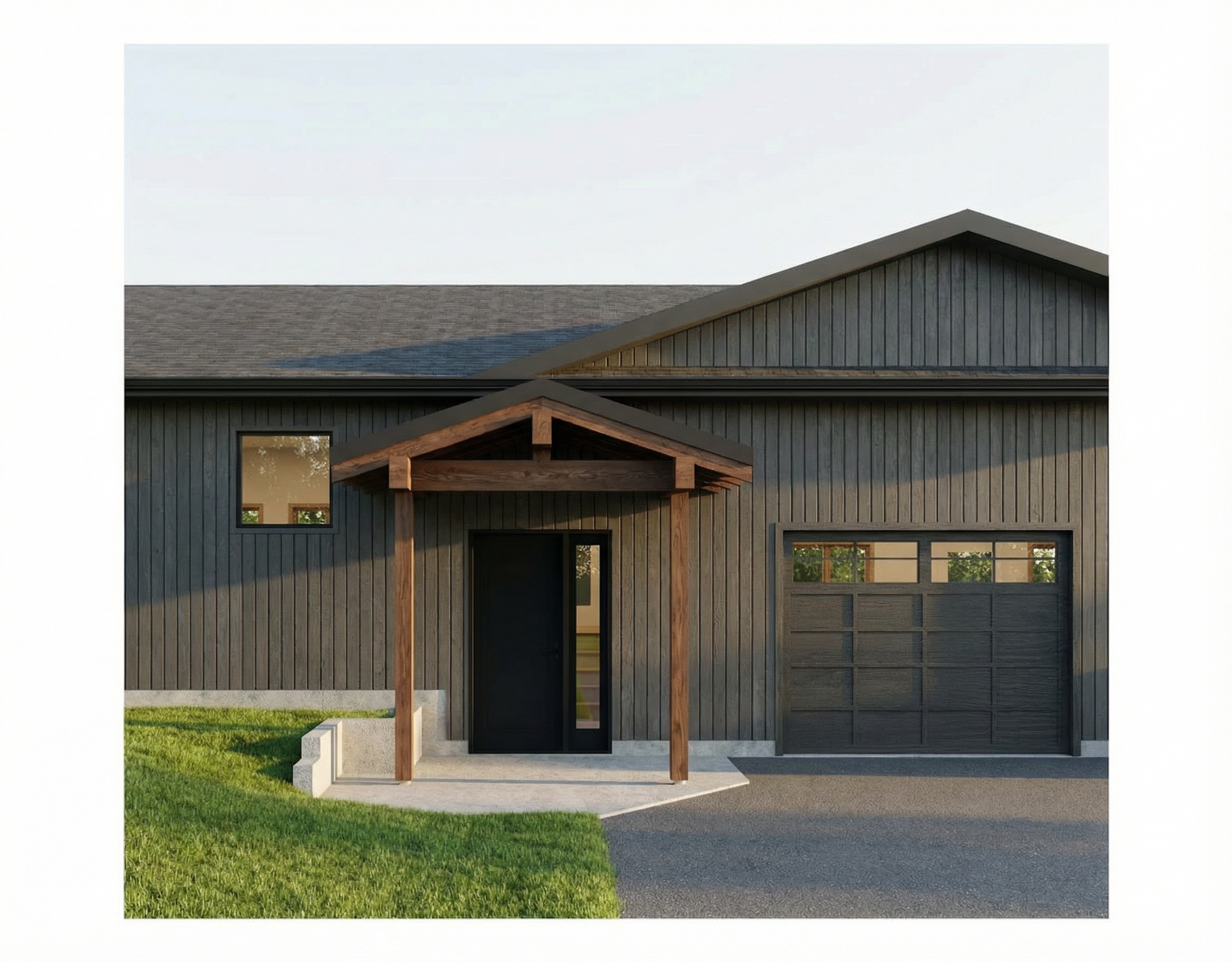 do not remove or change any geometry in image rough hewn tennessee fieldstone stained straight grain white oak tongue and groove ceiling dark metal window frames cold rolled steel beams blackened steel wall panels around kitchen range wall and above upper cabinets soapstone countertops and backsplash at range wall and shelving beyond dark stained walnut wall paneling above range dark stained walnut cabinetry above cabinets light coming from linear pendant above island smooth finished stucco walls sparse native plants outside evening light coming from windows on left side of kitchen add square can lights to ceiling no hardscape visible through windows