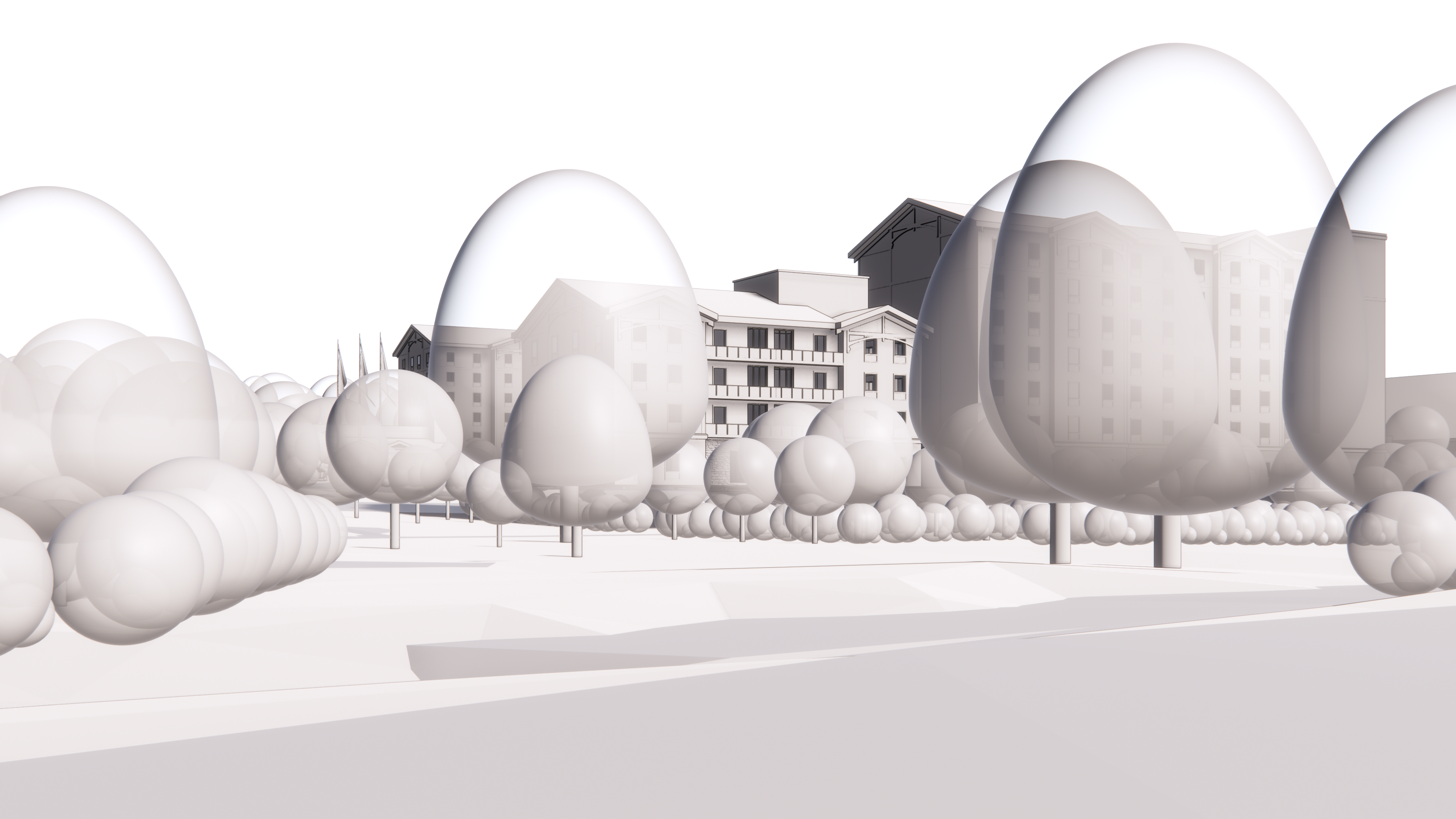add reflection to glass main building is surrounded by greenery surrounding buildings are to be brick with red tile roofs park many cars randomly on the car park and add cars on the roads add more greenery this is summer morning scene with sunlight coming from the bottom right side of the scene add railway line along the row of trees in the upper part of the image closer to the building make sure cars and railway match the scale of the building