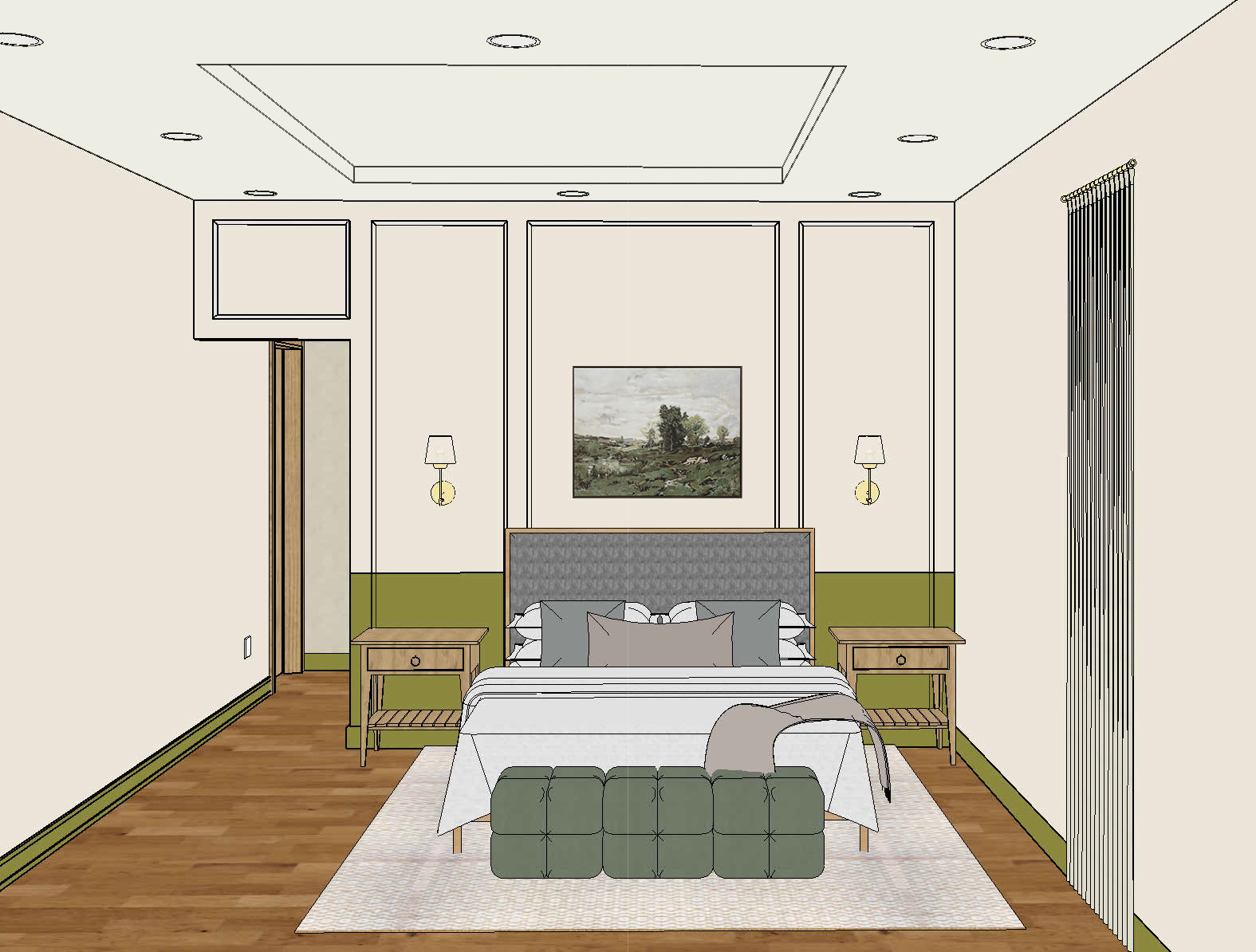 photorealistic interior render of a contemporary master bedroom maintaining exact layout proportions materials colors and furniture as provided in the reference image do not reinterpret or redesign any element preserve all existing elements centered upholstered bed with neutral bedding green upholstered bench at the foot of the bed matching wooden nightstands with lower shelf symmetrical wall sconces with warm light framed landscape artwork centered above the headboard and vertical blinds on the right side wall treatment must remain exactly as shown in the reference image upper walls warm off white cream lower section muted olive green only as a horizontal band baseboard detail do not extend the green color to full walls or other surfaces do not add or modify paint areas beyond what is shown maintain classic wall panel moldings exactly aligned with the artwork and bed the artwork must remain centered above the bed and within the central panel do not move resize or replace it flooring natural medium tone wood with visible grain area rug large soft textured light neutral tone under bed and bench ceiling recessed tray ceiling with integrated downlights add continuous concealed led strip lighting inside the ceiling cove following the perimeter the led should produce a soft indirect glow not overpowering the space lighting warm white 3000 3500k combining cove lighting recessed lights and wall sconces ensure realistic soft light distribution with subtle shadows include natural daylight filtering from the right through vertical blinds materials must remain true to the reference matte painted walls realistic fabric textures slightly reflective wood soft rug fibers style clean modern classic high end residential camera straight on centered on the bed eye level 1 5m symmetrical composition rendering quality ultra realistic global illumination soft shadows accurate reflections strict rule do not change colors materials wall paint distribution furniture placement or artwork position under any circumstances