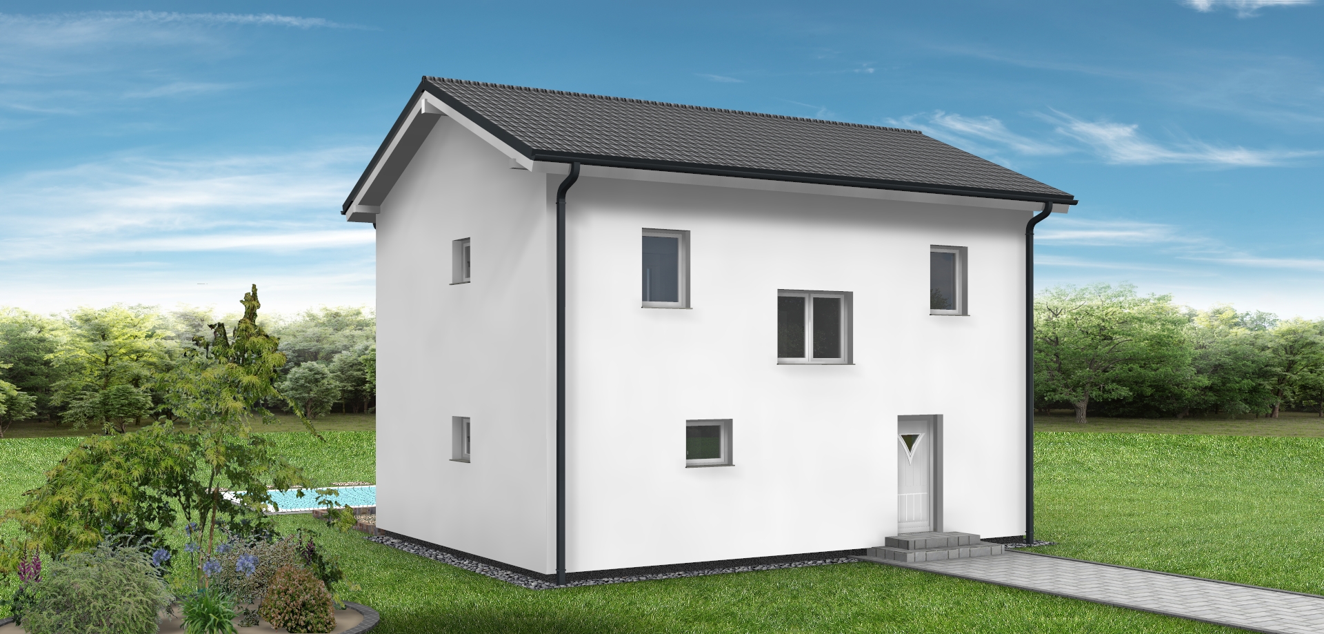 bitte erstelle f r exakt dieses haus eine realistische au enansicht neue dachziegel anthrazit fassade wei fenster und haust re wei das haus soll in einem dezent modernen garten situiert sein behalte alle ma e und farben des hauses exakt bei