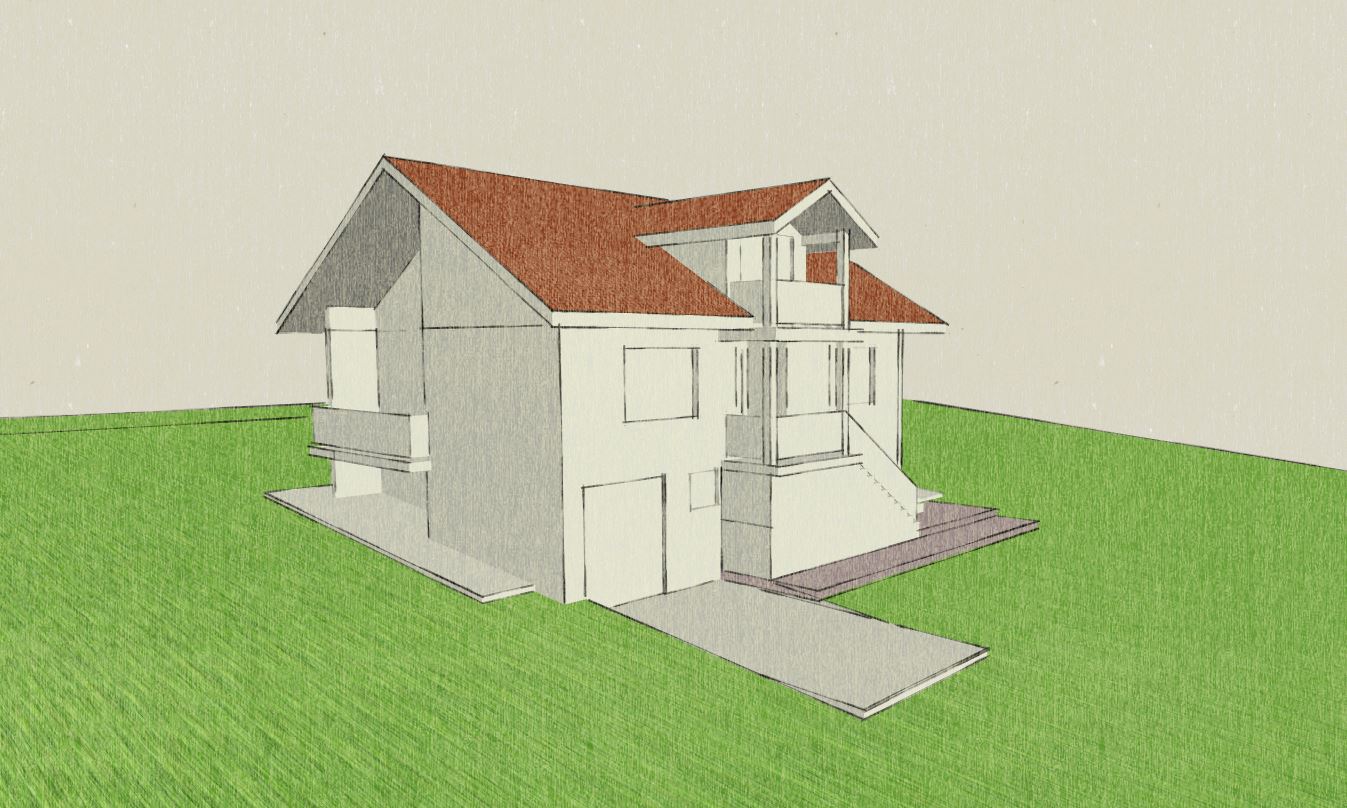modern two story house with a rustic red tiled roof white walls and clean architectural lines surround the house with lush vibrant green grass and a clear blue sky the atmosphere is serene and welcoming with soft natural lighting casting gentle shadows highlighting the structure s design include a concrete pathway leading to the entrance and emphasize the neat simple landscaping for a tranquil suburban feel