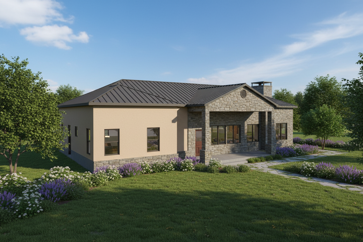 can you make this more realistic as if taken by a camera can you add some rural trees in the background make the yard look nice