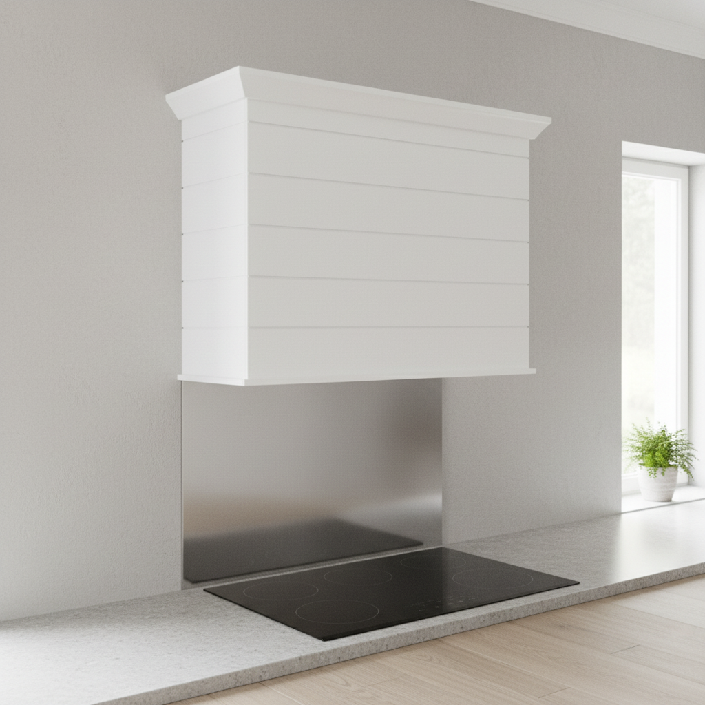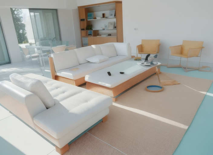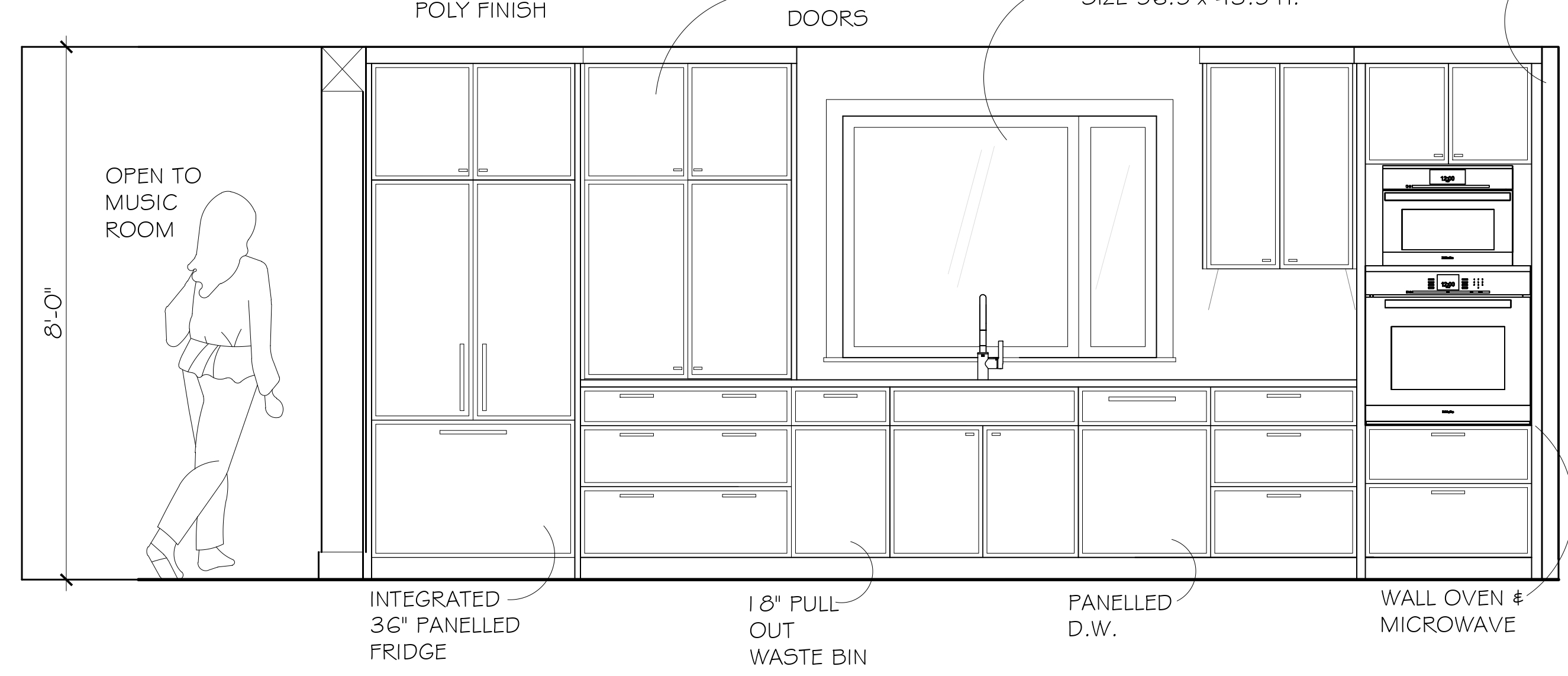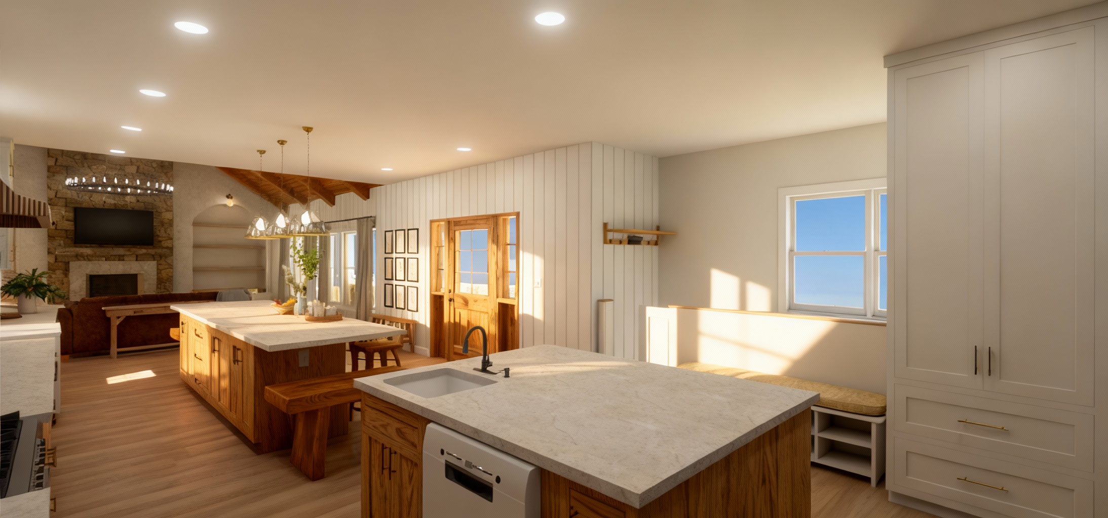 remove notes on drawing render to modern white kitchen cabinets with white oak floor and beige quartz counters