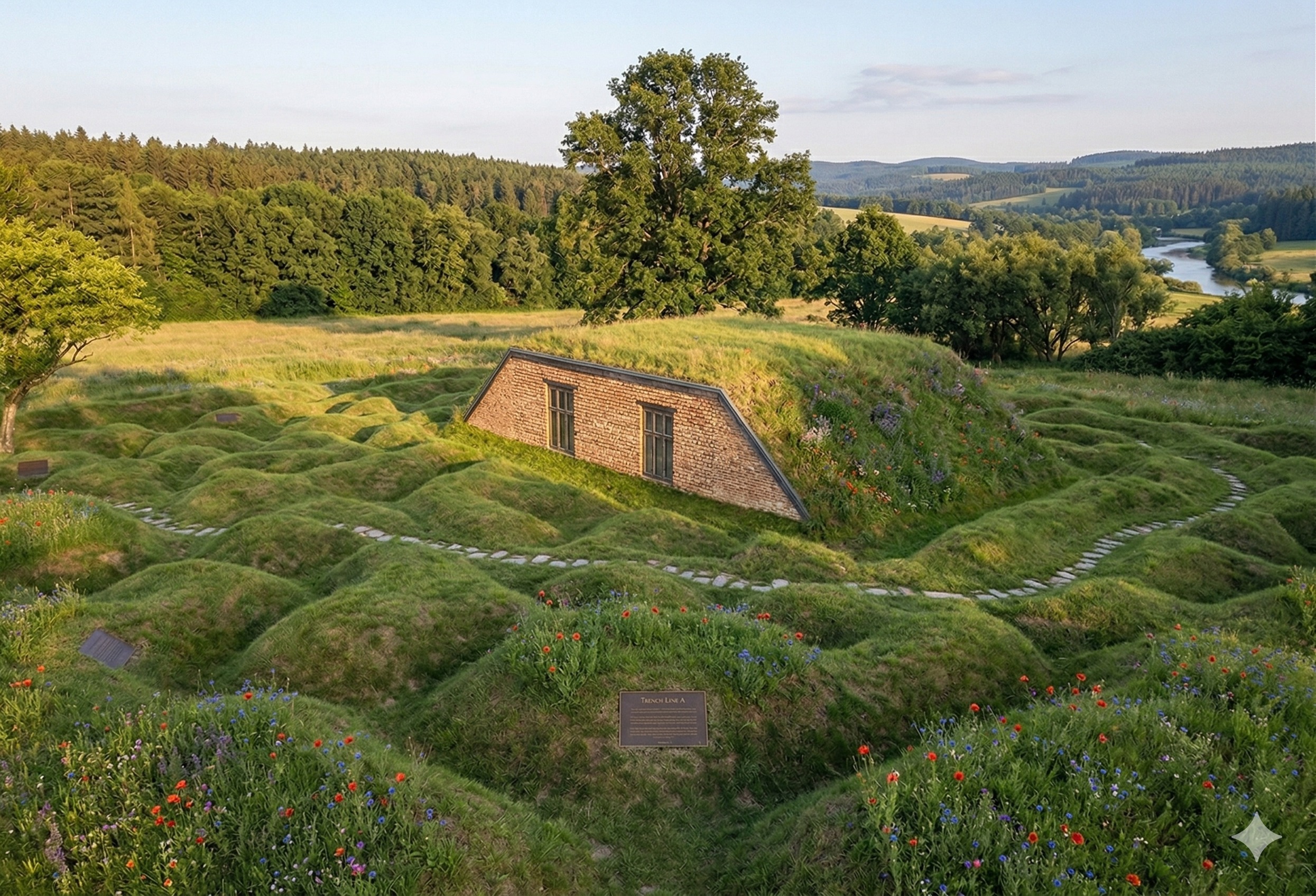 ww1 zborov memorial standard house built into the surrounding grass with little bumps in front to signify trenches back of the house has an entrance and gathering ground with sand for soldiers and visitors five flag poles and the sides of the house have windows