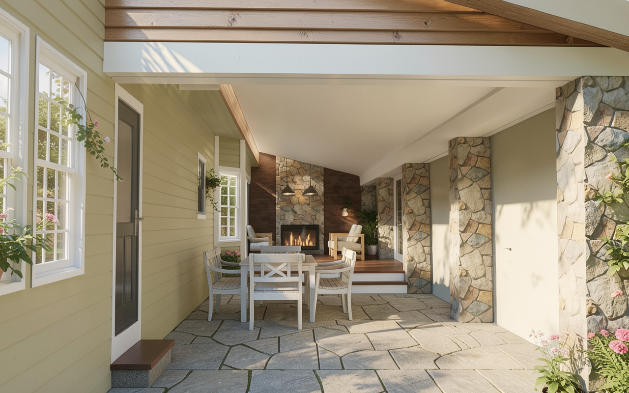 exterior shot ceramic only in the kitchen with wooden floor everywhere else cabinets over the stove in a beige colour add lighting over the island in the kitchen realistic colour and lighting